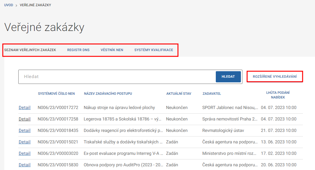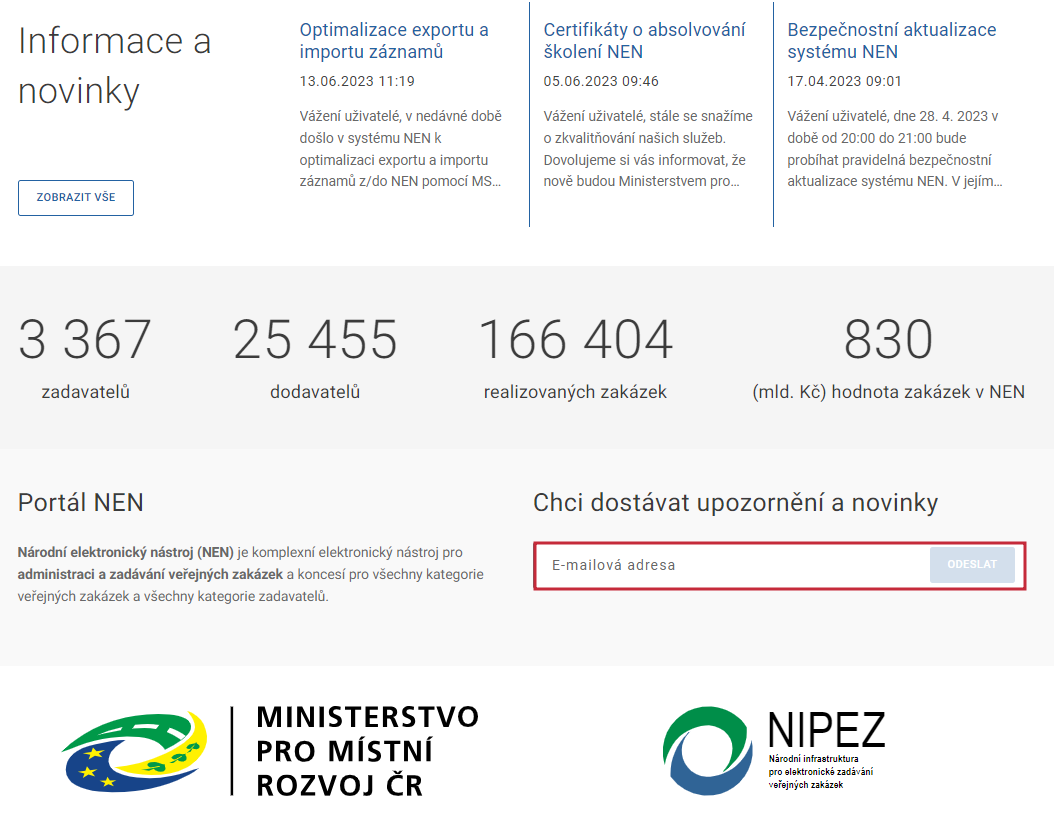 Veřejná stránka systému NEN je přístupná pro všechny Uživatele systému NEN. Naleznete zde informace k veřejným zakázkám a profilům zadavatelů, registry zadavatelů/dodavatelů, informace o probíhajícím školení o systému NEN či k ZZVZ, informace a novinky o systému NEN a registraci do systému NEN.