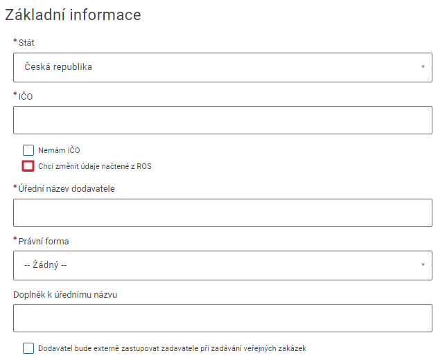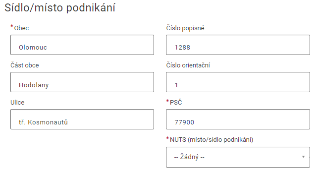 Seznam povinných polí se může změnit v závislosti na konkrétních údajích žadatele. Registrace se zakončuje odesláním žádosti. K žádosti je nutné přiložit vyplněný a elektronicky podepsaný Registrační formulář a další požadované dokumenty označené jako povinné.