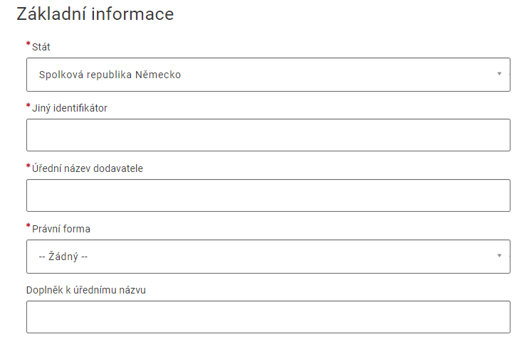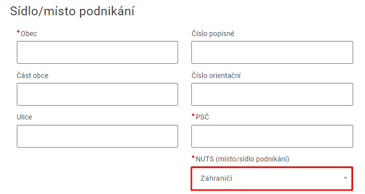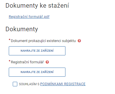Seznam povinných polí se může změnit v závislosti na konkrétních údajích žadatele. Registrace se zakončuje odesláním žádosti. K žádosti je nutné přiložit vyplněný a elektronicky podepsaný Registrační formulář a další požadované dokumenty označené jako povinné.
