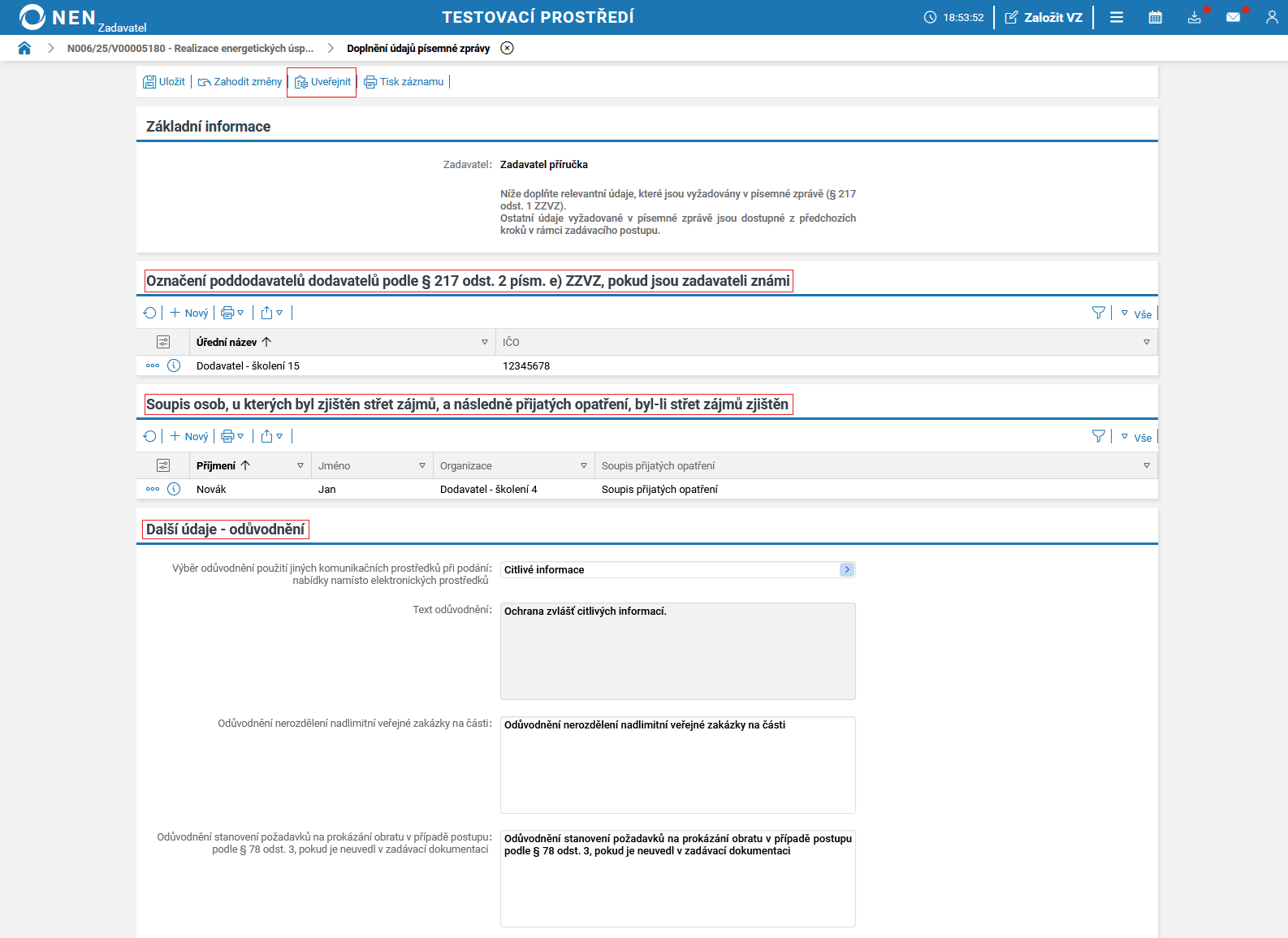 Na formuláři „Doplnění údajů písemné zprávy“ je nutné doplnit relevantní údaje, které jsou vyžadovány dle § 217 odst. 1 ZZVZ. Formulář neobsahuje údaje, které již v systému NEN jsou (např. druh zadávacího řízení, seznam účastníků atd.). Po vyplnění údajů tento úkon potvrďte tlačítkem „Uveřejnit“, které se nachází v horní liště.