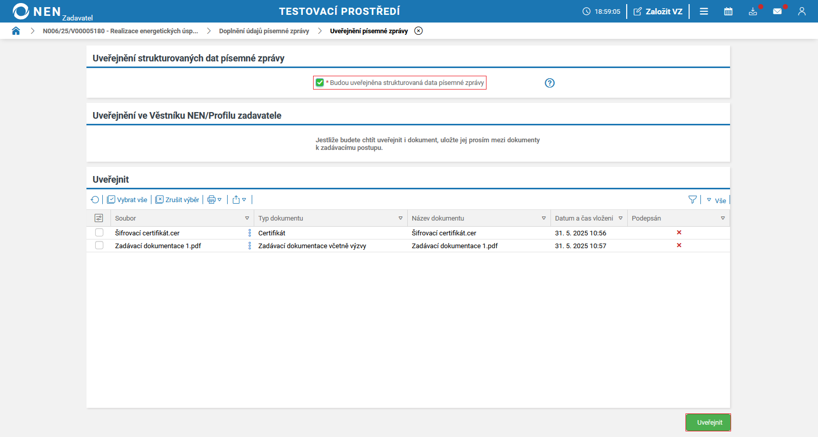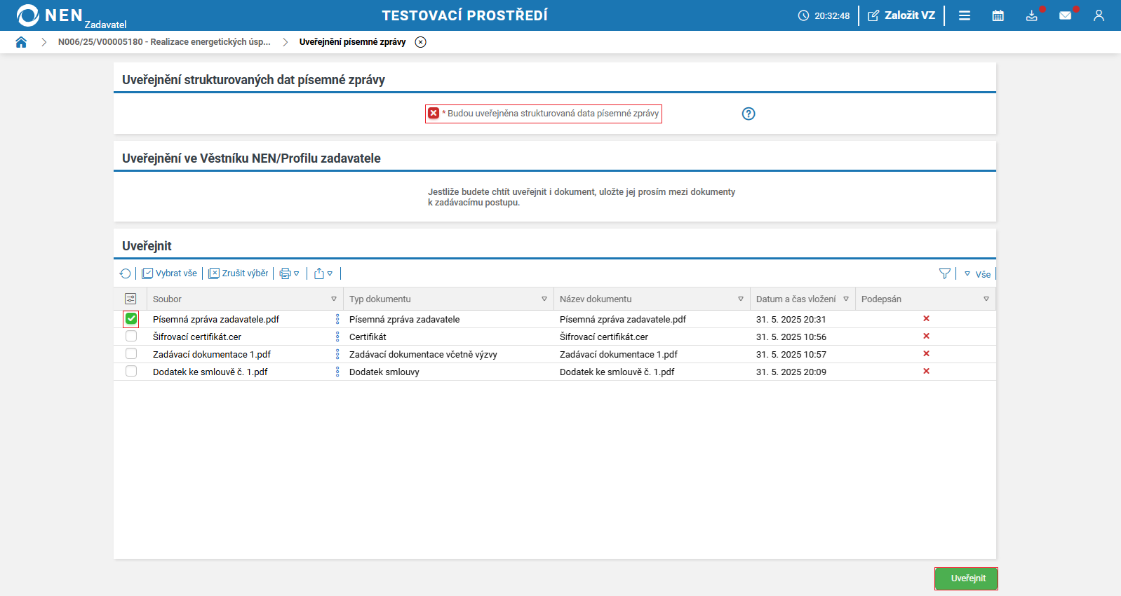 Systém NEN automaticky vloží „fajfku” u typu dokumentu „Písemná zpráva zadavatele”. V případě, že chcete využít možnosti uveřejnit údaje ve strojově čitelném formátu dle § 217 odst. 5 ZZVZ, tedy chcete uveřejnění strukturovaných dat, nastavte checkbox „Budou uveřejněna strukturovaná data písemné zprávy“ na „fajfku”. Tento úkon potvrďte tlačítkem „Uveřejnit“, které se nachází v pravém dolním rohu.