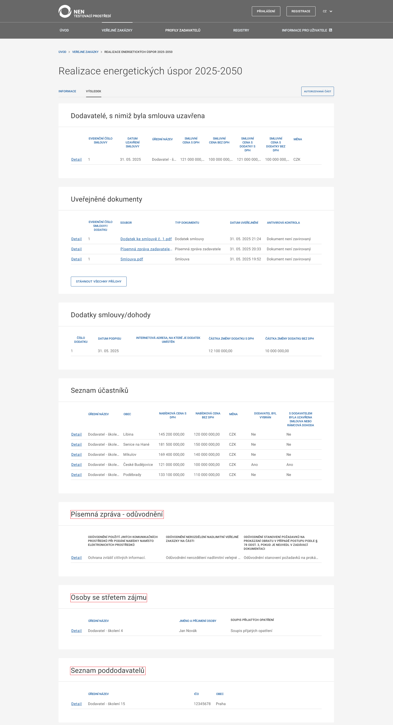 Systém NEN počítá s řadou dodatků a vždy je zobrazí v autorizované části ve sloupci „Smluvní cena s dodatky bez DPH“ a „Smluvní cena s dodatky s DPH“.