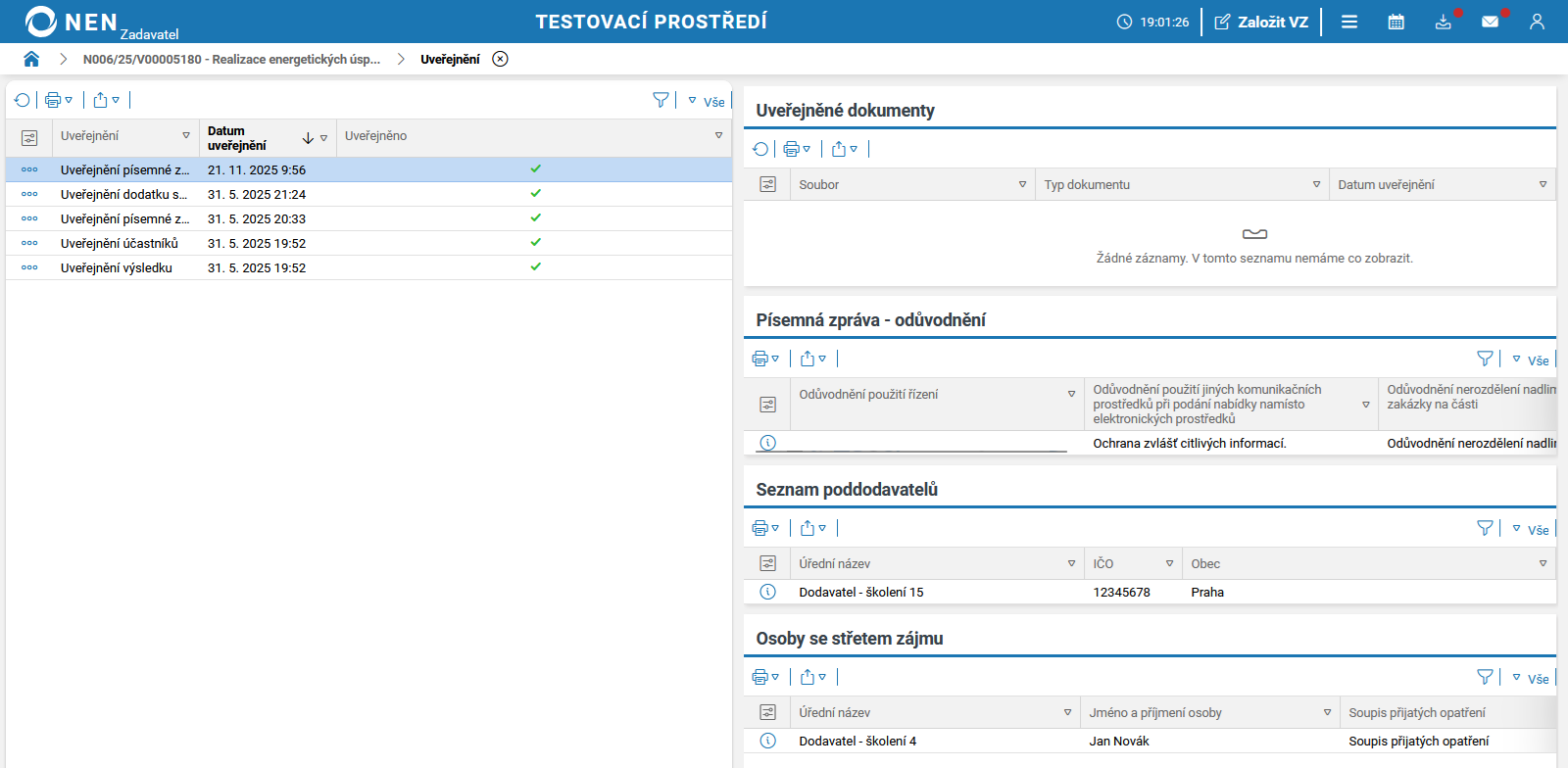 Informace jsou také zobrazeny po kliknutí na „Uveřejnění” → „Evidence uveřejnění v NEN” → „Uveřejnění písemné zprávy”.