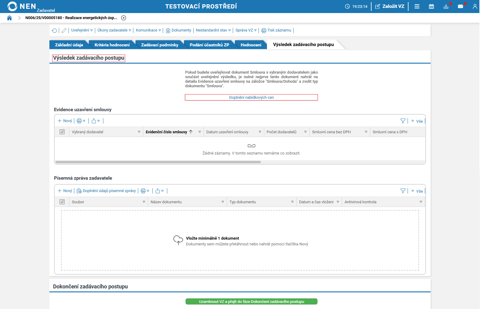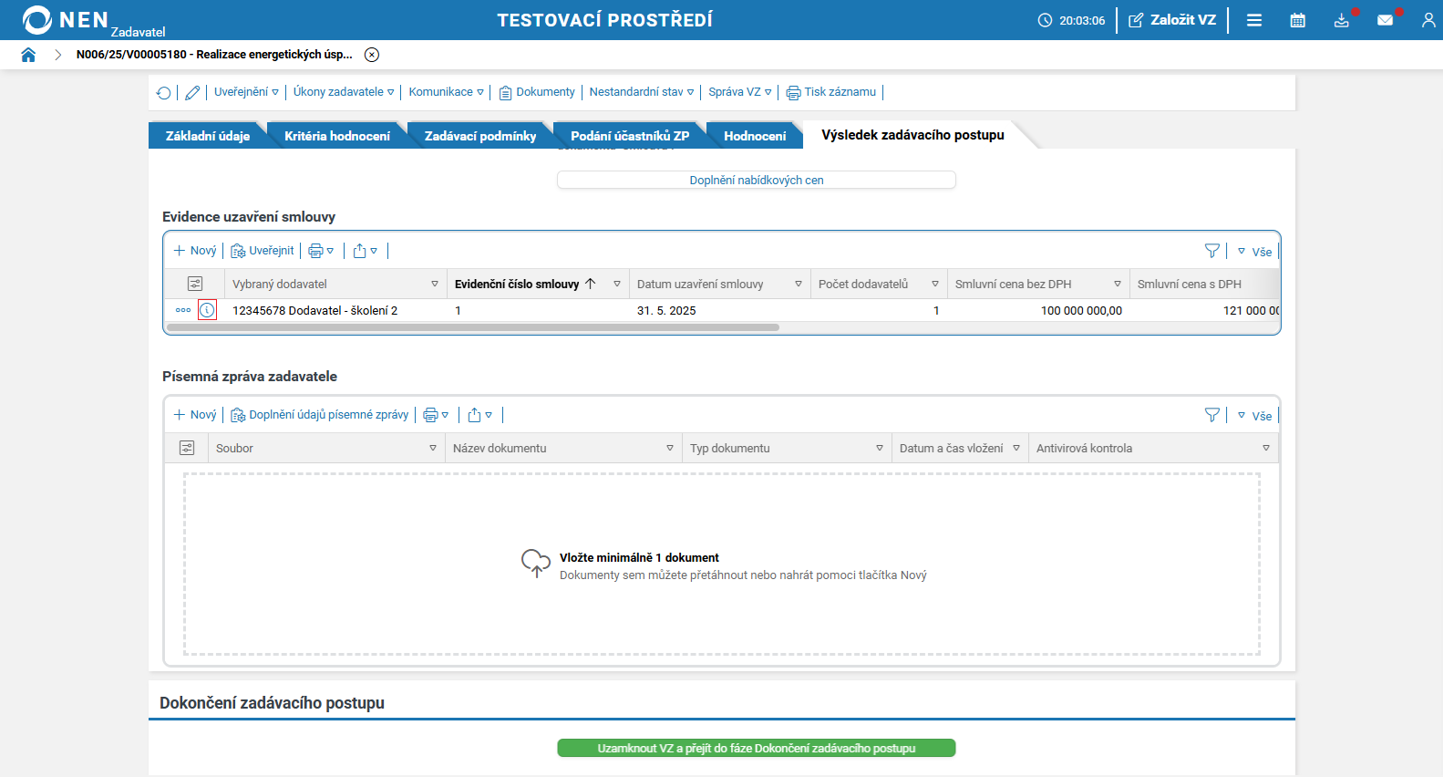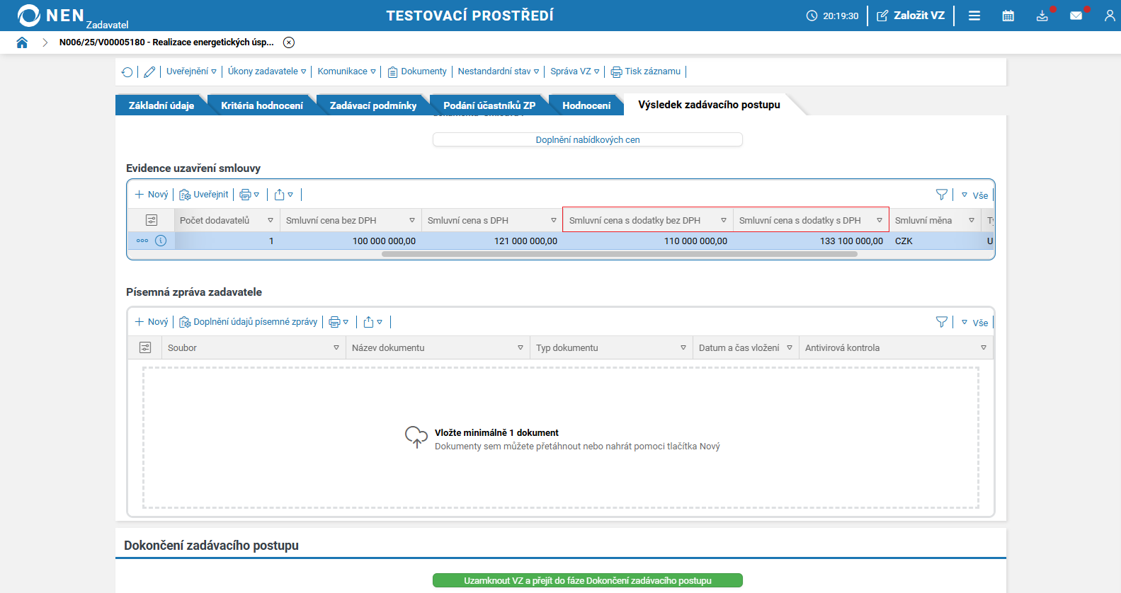 Smlouvu do systému NEN evidujete až po skutečném uzavření smlouvy. Zaevidování smlouvy pro systém NEN znamená, že je zadávací postup ukončen. Po zaevidování smlouvy již nebude možné provádět v zadávacím postupu změny.