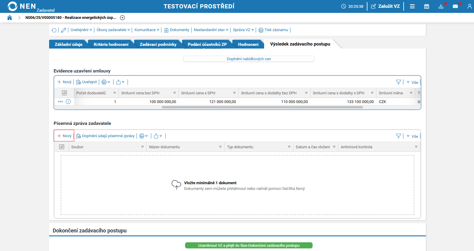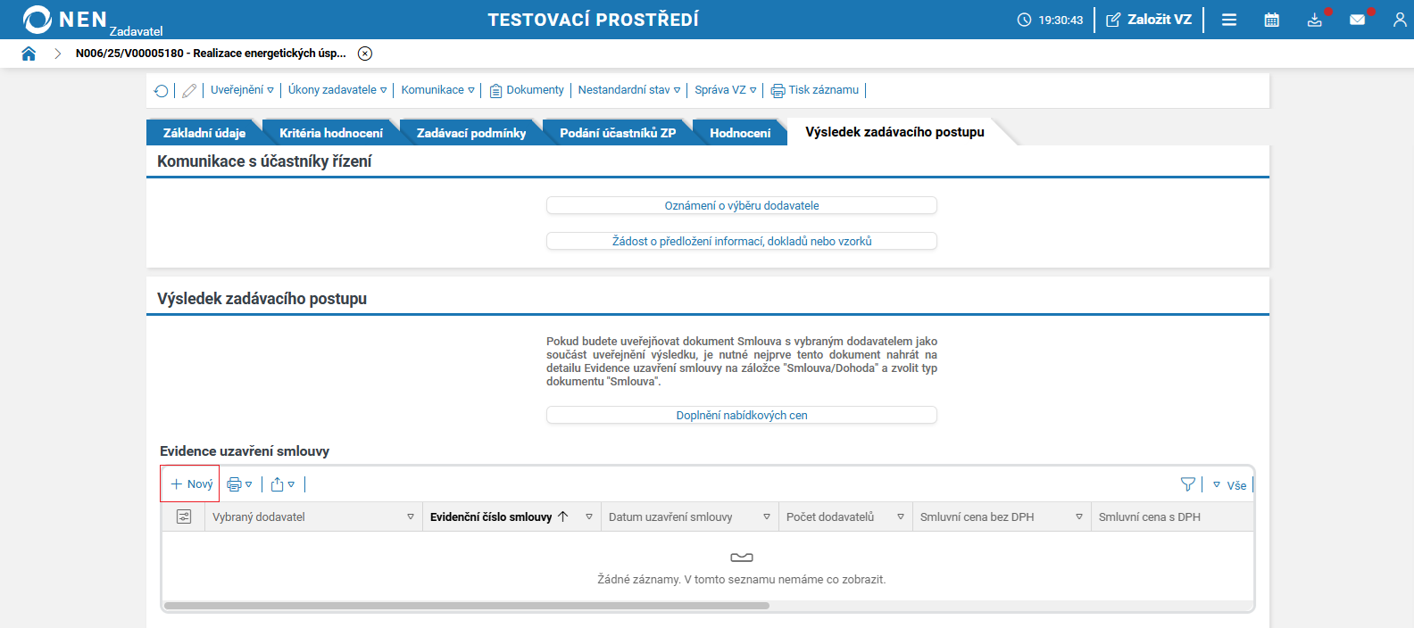 Systém NEN umožní evidovat více smluv jako výsledek jednoho zadávacího postupu. Po uzavření smlouvy/smluv zaevidujte výsledek zadávacího postupu do systému NEN, a to pomocí tlačítka „Nový“ v menu tabulky s evidencí uzavření smlouvy.