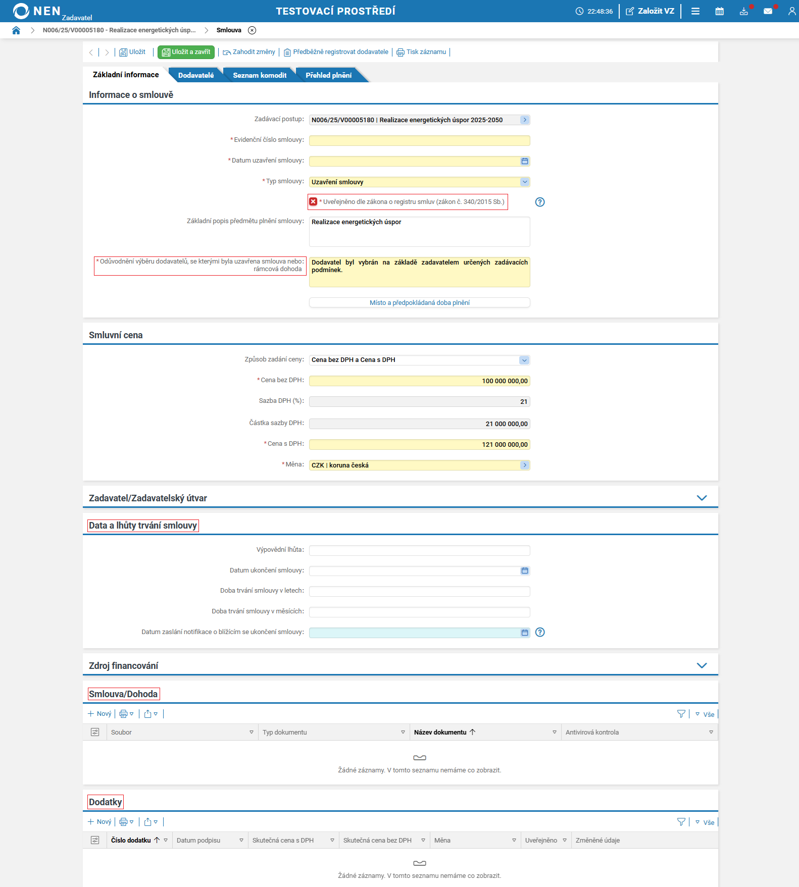 Pokud ve výše uvedeném checkboxu ponecháte „křížek”, systém NEN vyžaduje vložení smlouvy na záložce „Základní informace“ v bloku „Smlouva/Dohoda“.