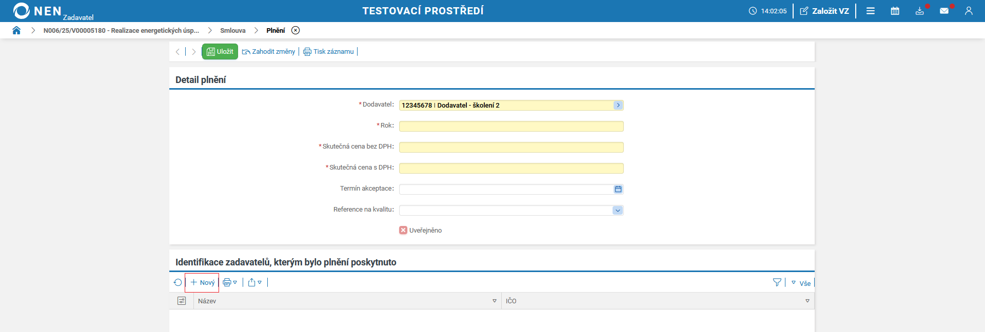Na této záložce systém NEN umožní zaevidovat plnění (skutečně uhrazenou cenu), a to pomocí tlačítka „Nový“.