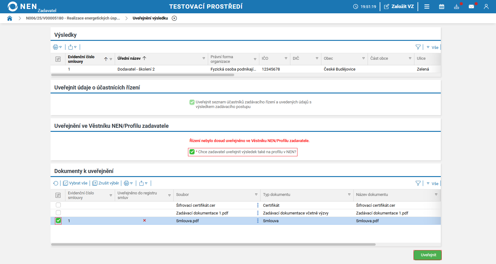 Systém NEN automaticky se smlouvou uveřejní i seznam účastníků zadávacího řízení. Pokud budete chtít uveřejnit výsledek na profilu v NEN, nastavte na „fajfku” checkbox „Chce zadavatel uveřejnit výsledek také na profilu v NEN?”. Vyberte dokumenty, které potřebujete uveřejnit spolu s výsledkem, případně, pokud potřebujete uveřejnit pouze výsledek, neoznačujte žádný z dokumentů. Tento úkon potvrďte tlačítkem „Uveřejnit“, které se nachází v pravém dolním rohu.