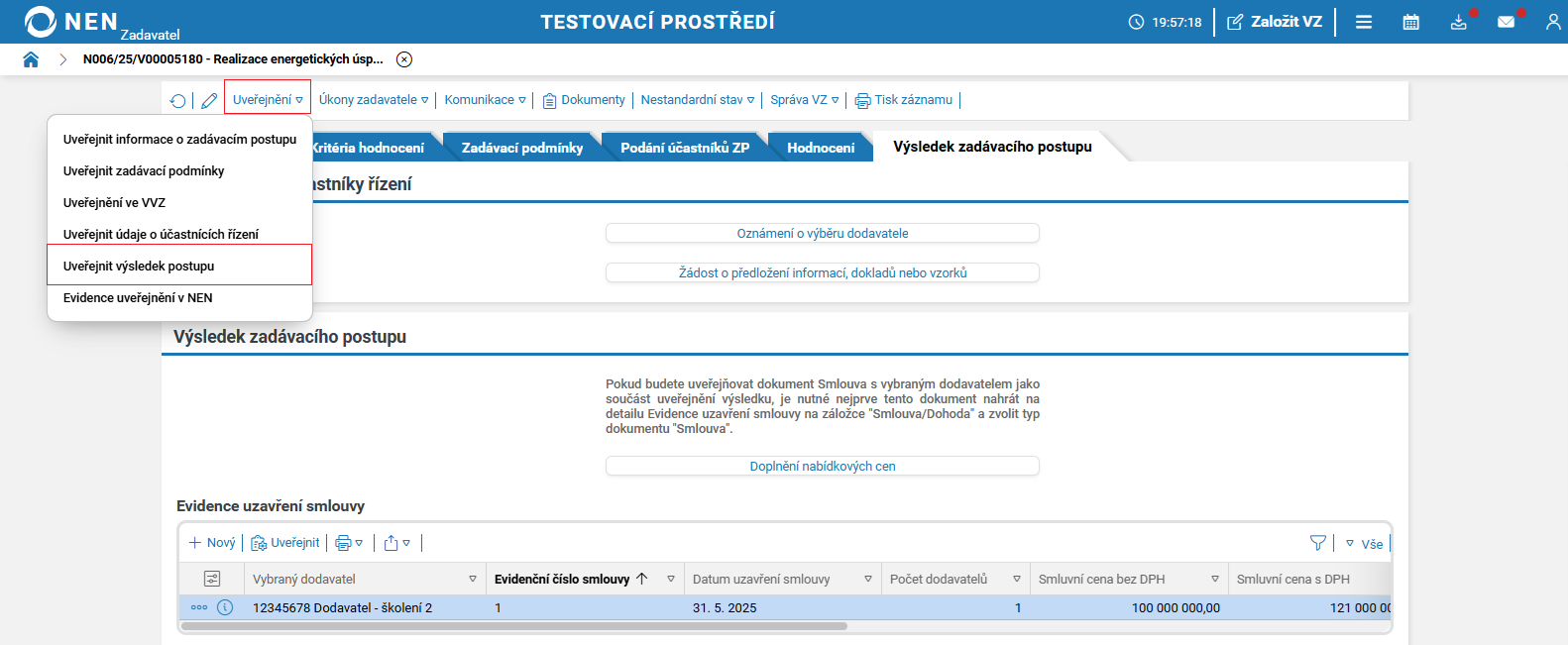 Uveřejnění výsledku můžete provést taktéž přes tlačítka „Uveřejnění“ → „Uveřejnit výsledek postupu“, která se nachází v horní liště. V případě, kdy podává nabídku více dodavatelů společně ve sdružení dodavatelů, dojde k uveřejnění všech členů sdružení, kteří budou zobrazeni při stisknutí tlačítka „Detail“ u vybraného dodavatele v bloku „Seznam účastníku“ ve výsledku zadávacího postupu na veřejné stránce systému NEN.