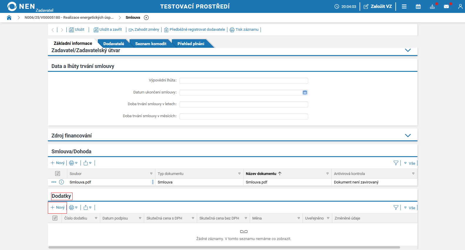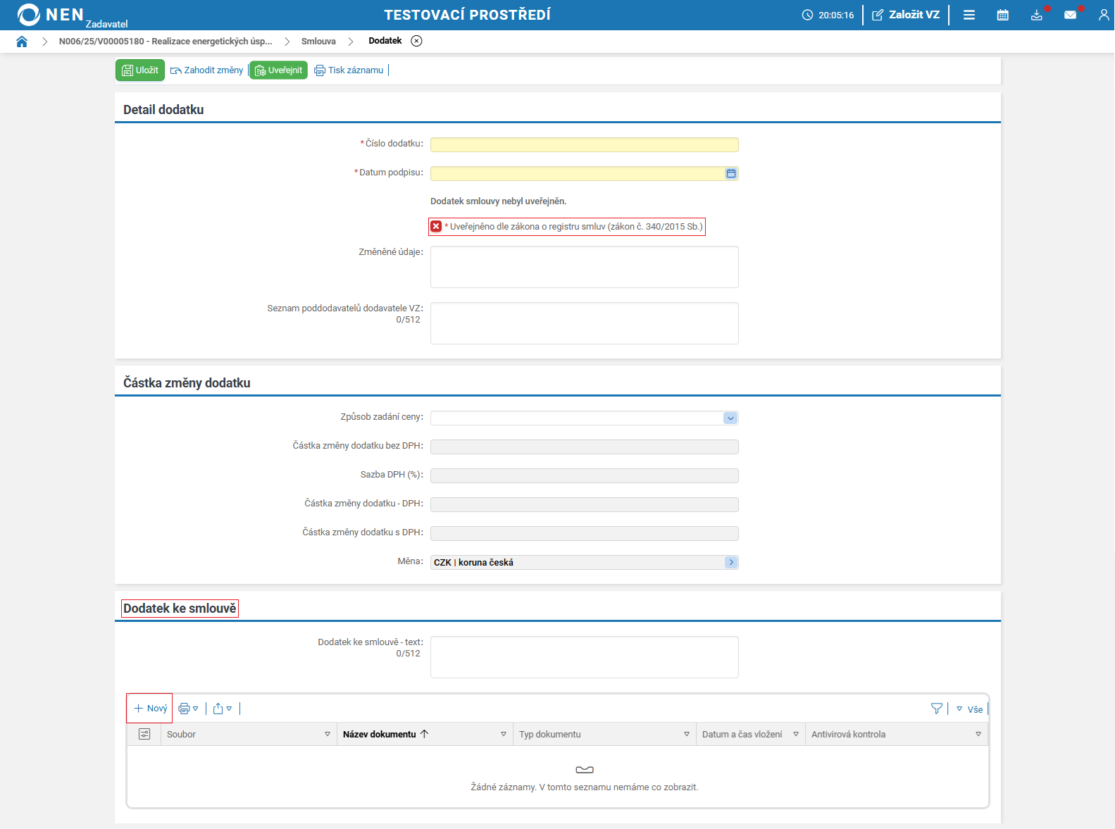 Pokud ve výše uvedeném checkboxu ponecháte „křížek”, systém NEN vyžaduje vložení dodatku na záložce v bloku „Dodatek ke smlouvě“.