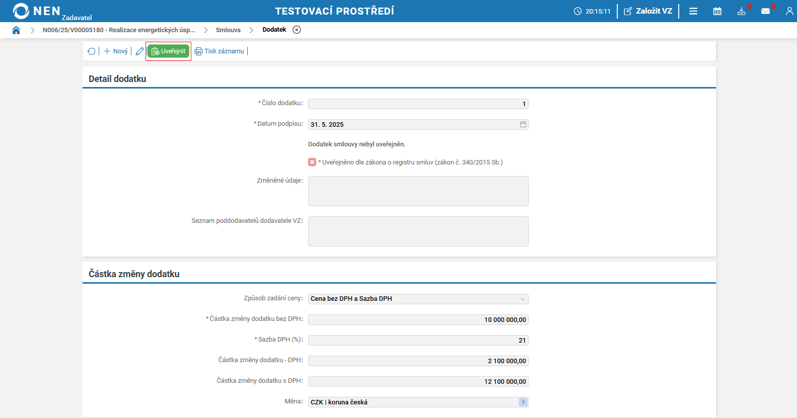 Aby došlo k uveřejnění „Aktualizované smluvní ceny“ na profil zadavatele, je nutné uveřejnit dodatek, a to pomocí tlačítka „Uveřejnit”, které se nachází v horní liště. Systém NEN bude společně s uveřejněním dodatku smlouvy uveřejňovat data výsledku (smlouvy) zadávacího postupu.