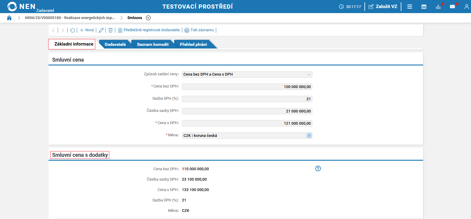 Po uložení dodatku systém NEN na záložce „Základní informace” zobrazí blok „Smluvní cena s dodatky”.