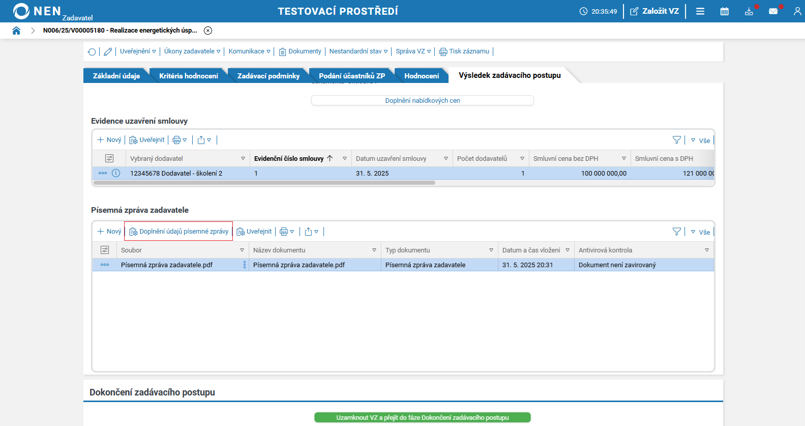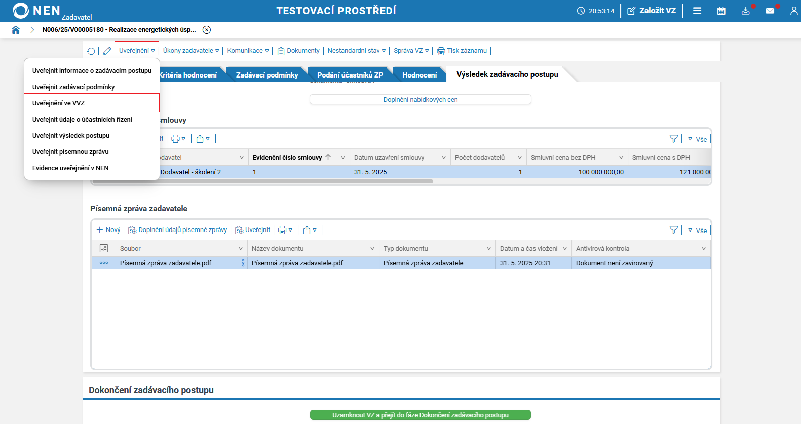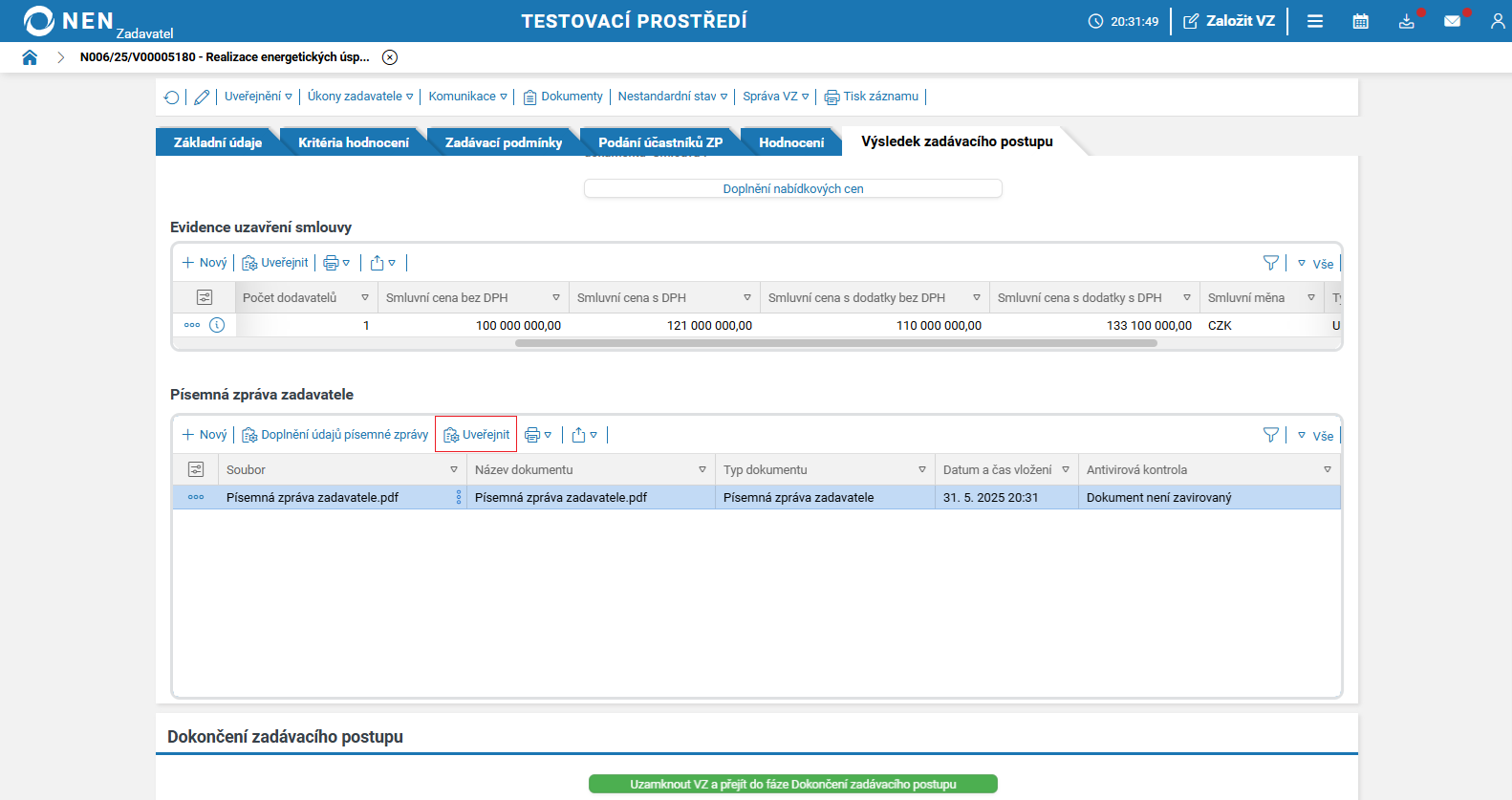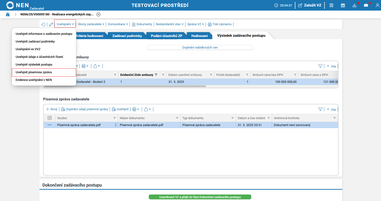Písemnou zprávu zadavatele uveřejněte tlačítkem „Uveřejnit“, které se nachází v liště.