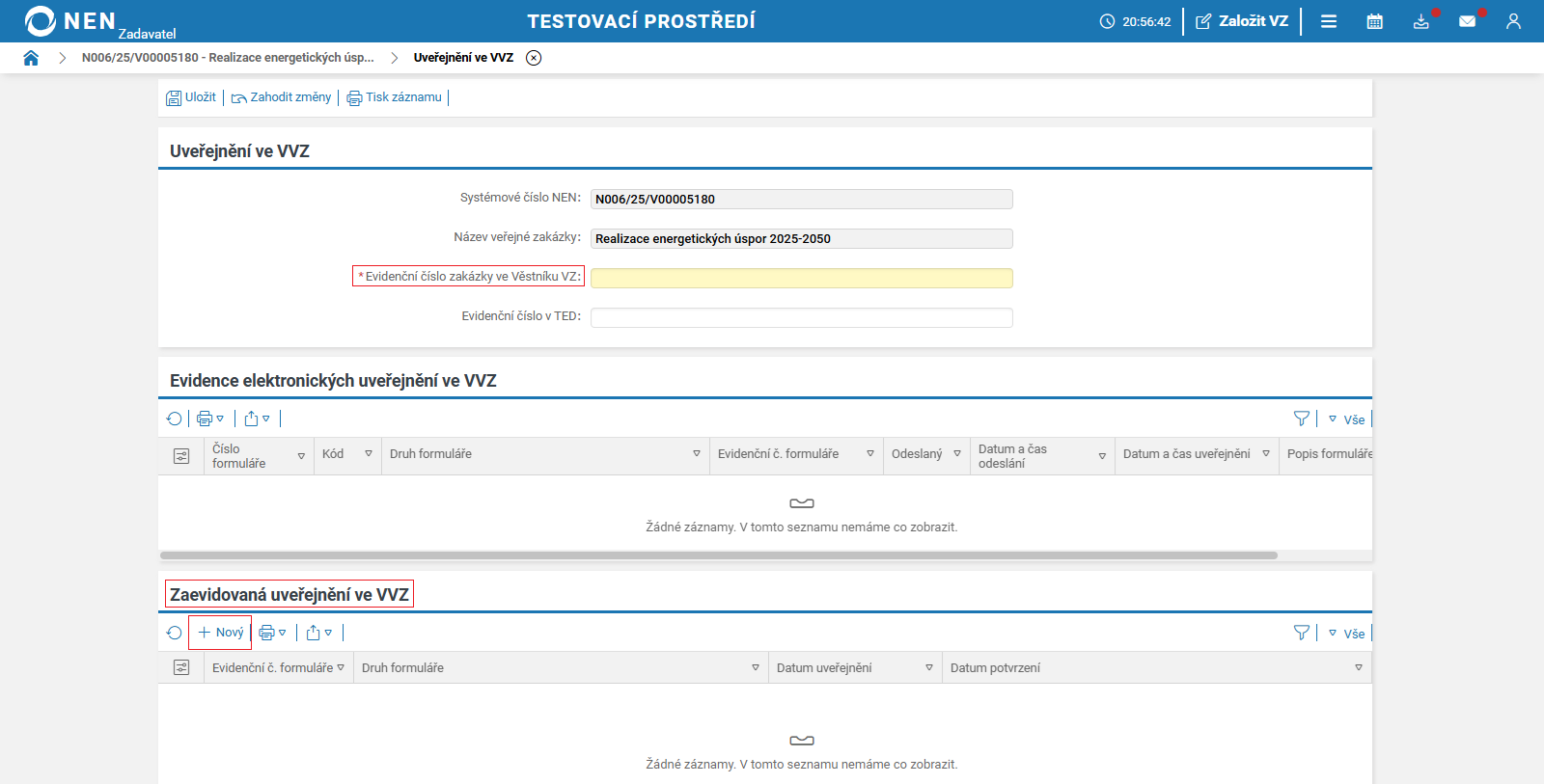 Formulář je nutné nejdříve uveřejnit ve VVZ a až poté zaevidovat do systému NEN. Vyplňte pole „Evidenční číslo zakázky ve Věstníku VZ”. Následně zaevidování uveřejnění ve VVZ provedete pomocí tlačítka „Nový“ v tabulce „Zaevidovaná uveřejnění ve VVZ“.