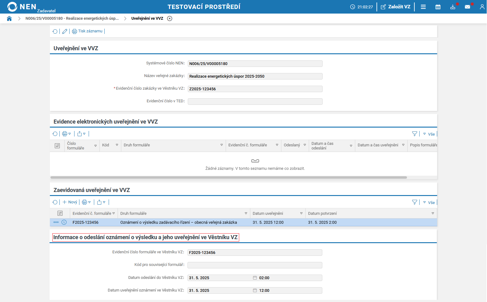 Odesílání formulářů do VVZ prostřednictvím systému NEN se dočasně neaplikuje. V současné době systém NEN umožňuje pouze evidenční rovinu. Pokud chcete údaj zaevidovat, zapište evidenční číslo ve formátu např. Z2025-123456, kde 2025 je označení roku a 123456 odpovídá číslu zakázky.