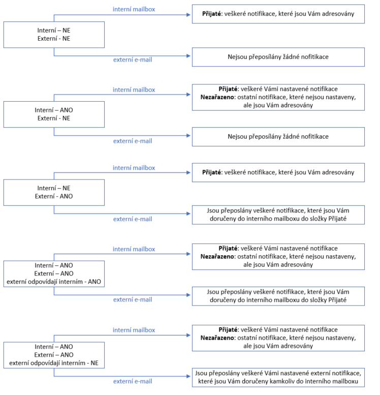V případě, že se nastavení interních a externích notifikací liší, zasílá systém NEN notifikace do interního mailboxu dle nastavení interních notifikací a na Vaši e-mailovou adresu dle nastavení externích notifikací. Tudíž může dojít k situaci, kdy v interním mailboxu máte notifikaci ve složce „Nezařazeno”, ale i přesto je Vám zaslána na Vaši e-mailovou adresu.