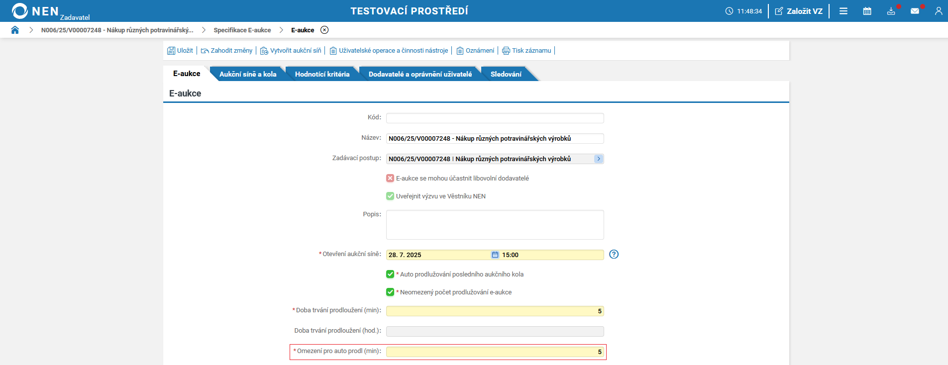 Po vyplnění data a času v povinném poli „Otevření aukční síně” se automaticky vyplní pole „Uzavření aukční síně” hodnotou o 30 minut větší než otevření. Jedná se o předpokládané datum a čas, kdy se ukončí aukční síň i aukční kolo. Datum a čas může být prodlužován příhozy dodavatelů dle nastavených pravidel pro automatické prodlužování. Tuto systémem NEN přednastavenou hodnotu můžete změnit.