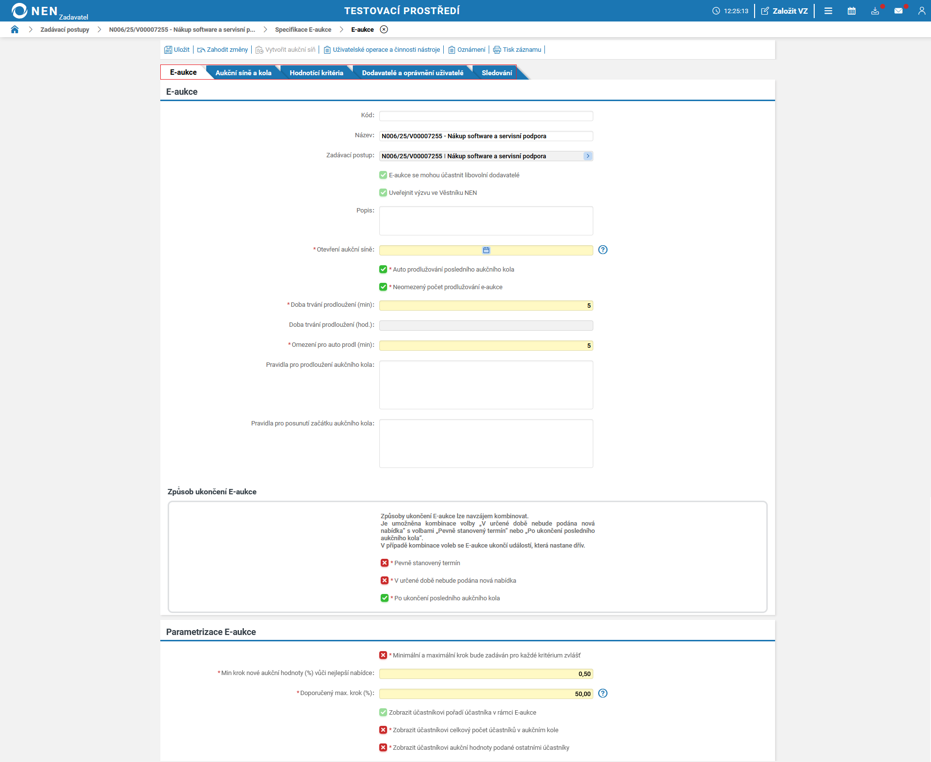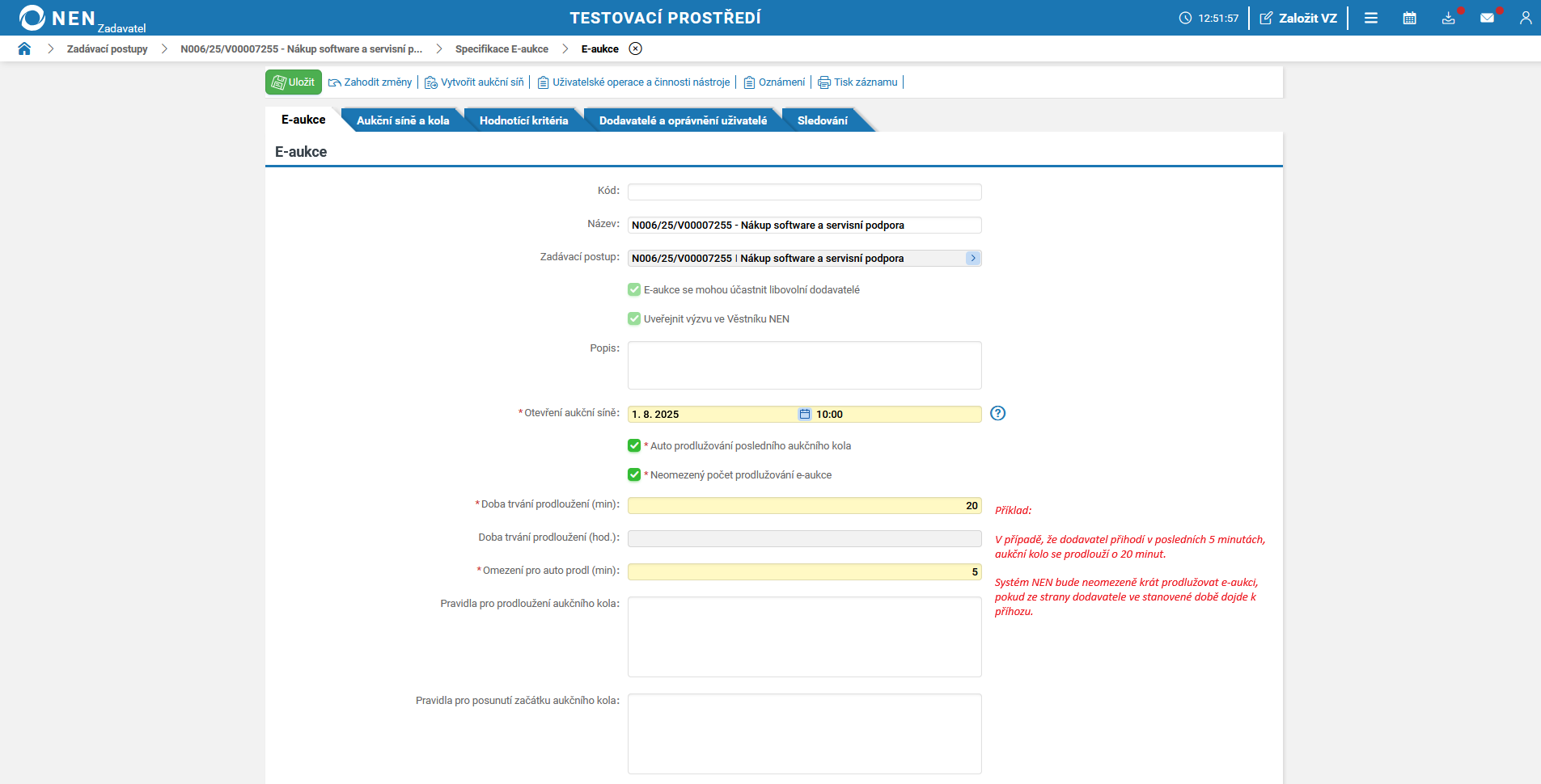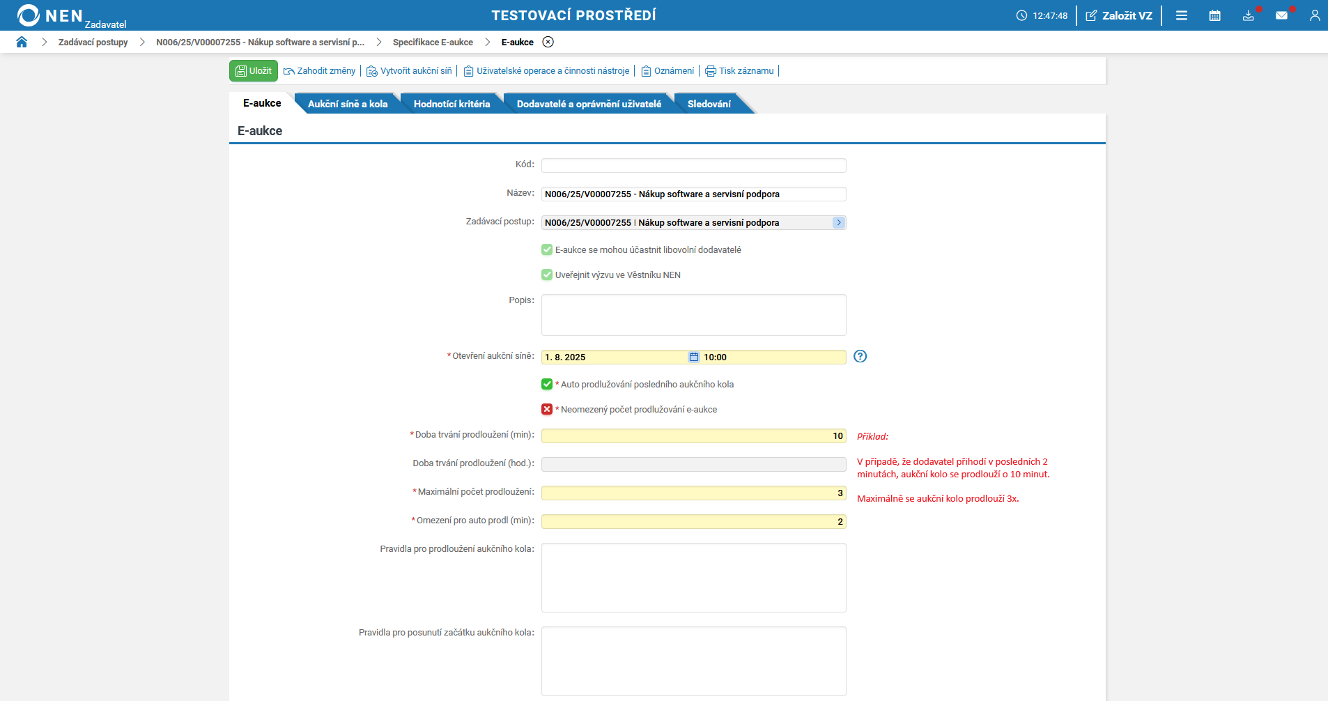 V průběhu aukčního kola můžete administrovat průběh e-aukce, nicméně není již možné měnit parametry nastavení e-aukce, např. kritéria hodnocení, počet aukčních kol atd.