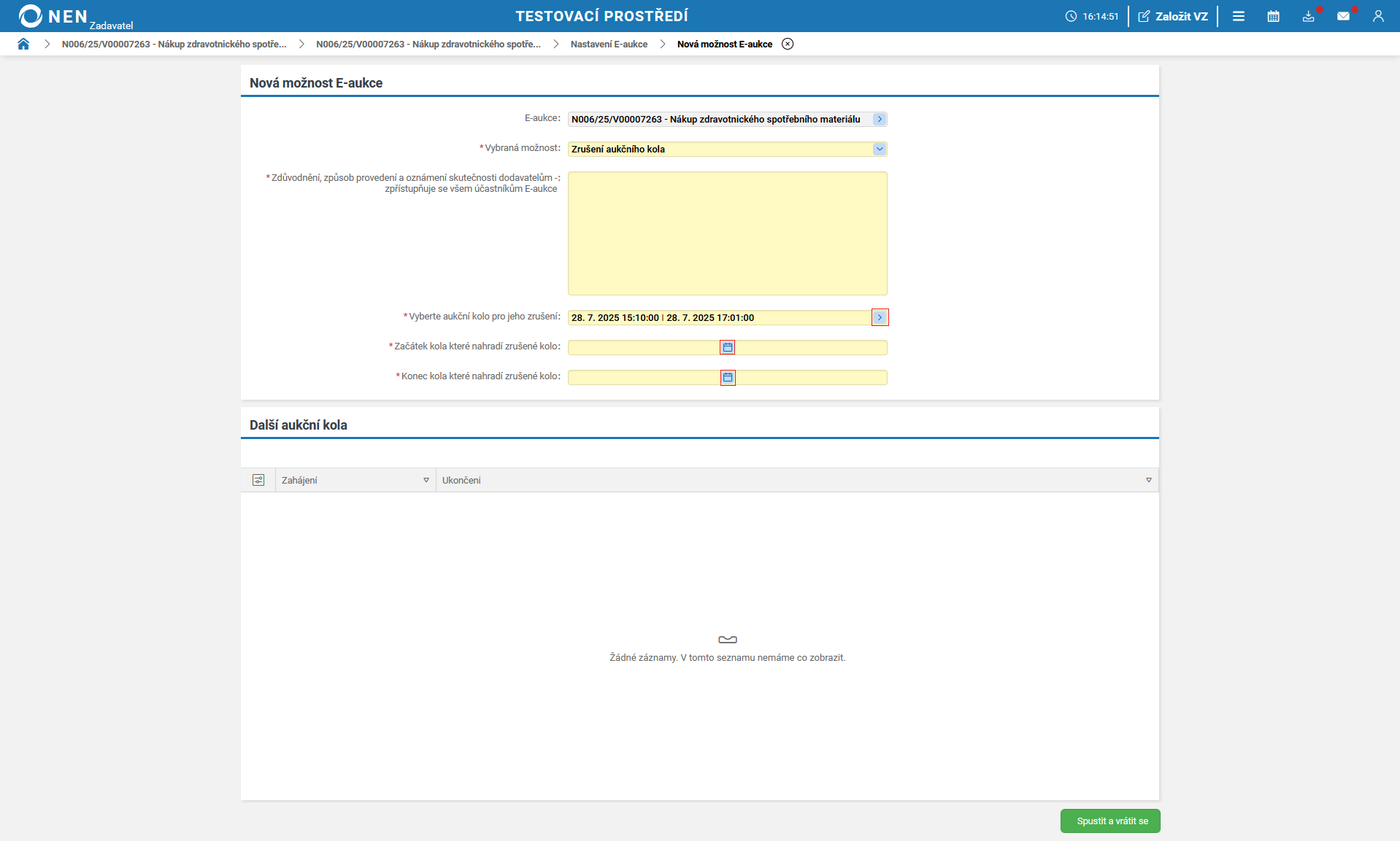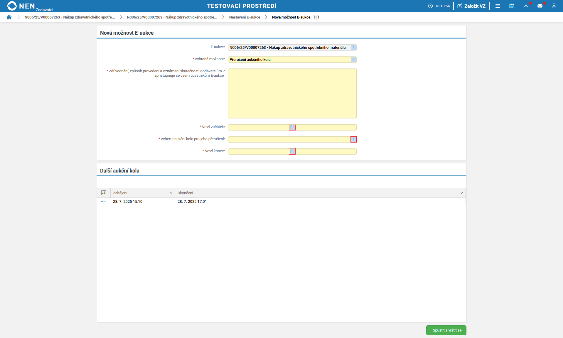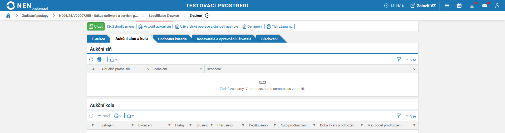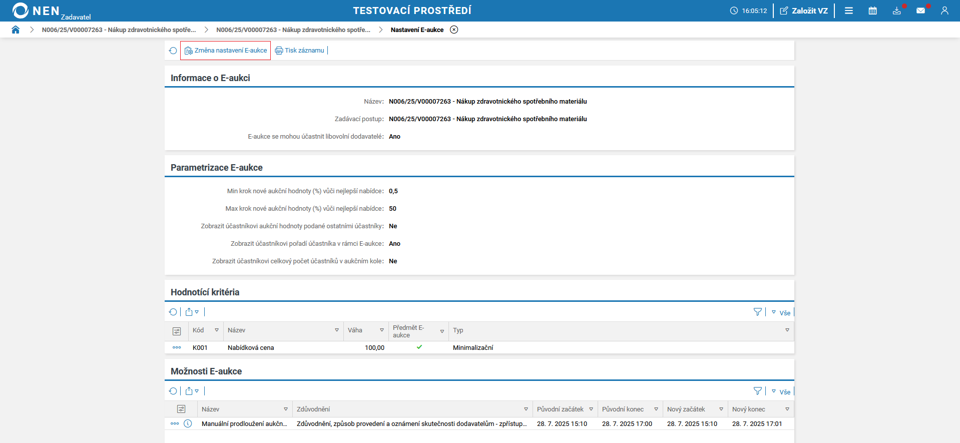 V průběhu aukčního kola můžete administrovat průběh e-aukce, nicméně není již možné měnit parametry nastavení e-aukce, např. kritéria hodnocení, počet aukčních kol atd.