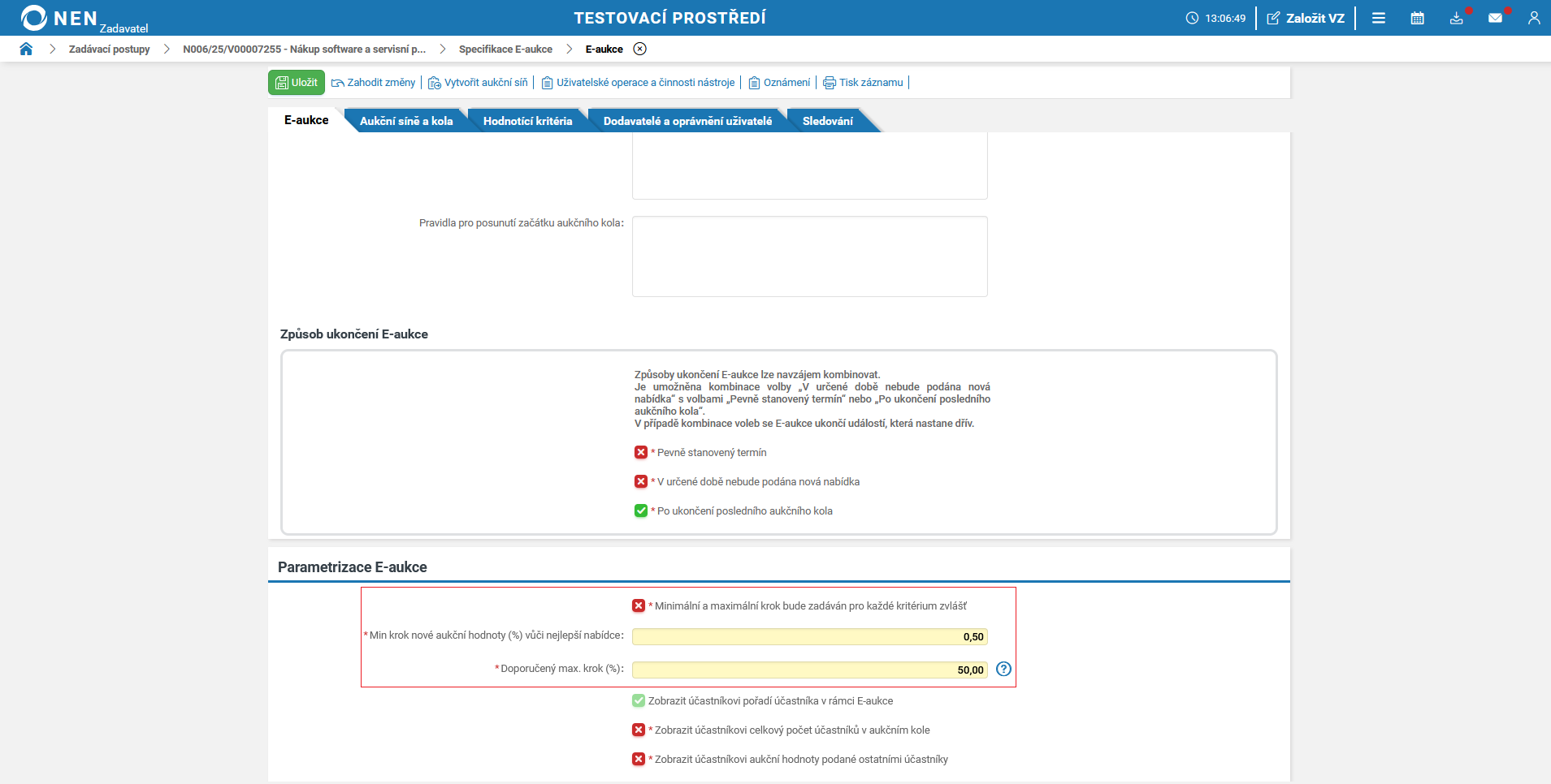 Systém NEN automaticky vyplní pole „Min krok nové aukční hodnoty (%) vůči nejlepší nabídce” hodnotou 0,5, kterou si můžete upravit. Jedná se o minimální krok nové aukční hodnoty ve vztahu k dosud učiněné nejlepší nabídce. Hodnota je v procentech a platí pro celou e-aukci.