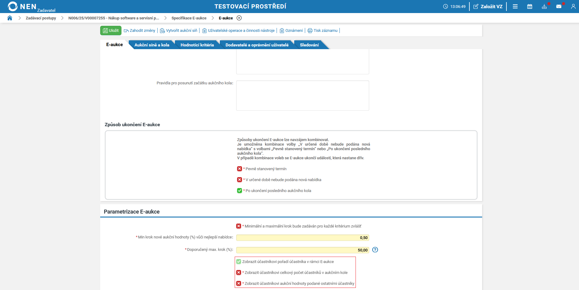 Checkbox je defaultně nastaven na „fajfku” s možností editace. V tomto případě systém NEN bude neomezeně prodlužovat aukci, pokud dojde ve stanovené době k příhozu měnícím pořadí dodavatele.