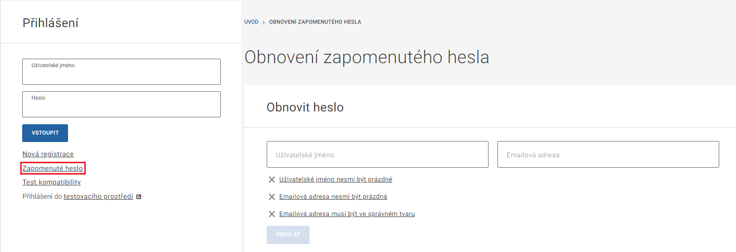 Každý Uživatel systému NEN si může sám obnovit zapomenuté heslo. Na formuláři pro přihlášení do systému NEN klikněte na tlačítko „Zapomněli jste heslo“ a dále pokračujte vložením uživatelského jména a e-mailové adresy Vašeho uživatelského účtu. Heslo Uživatele systému NEN může obnovit rovněž administrátor subjektu a Uživatelská podpora systému NEN.