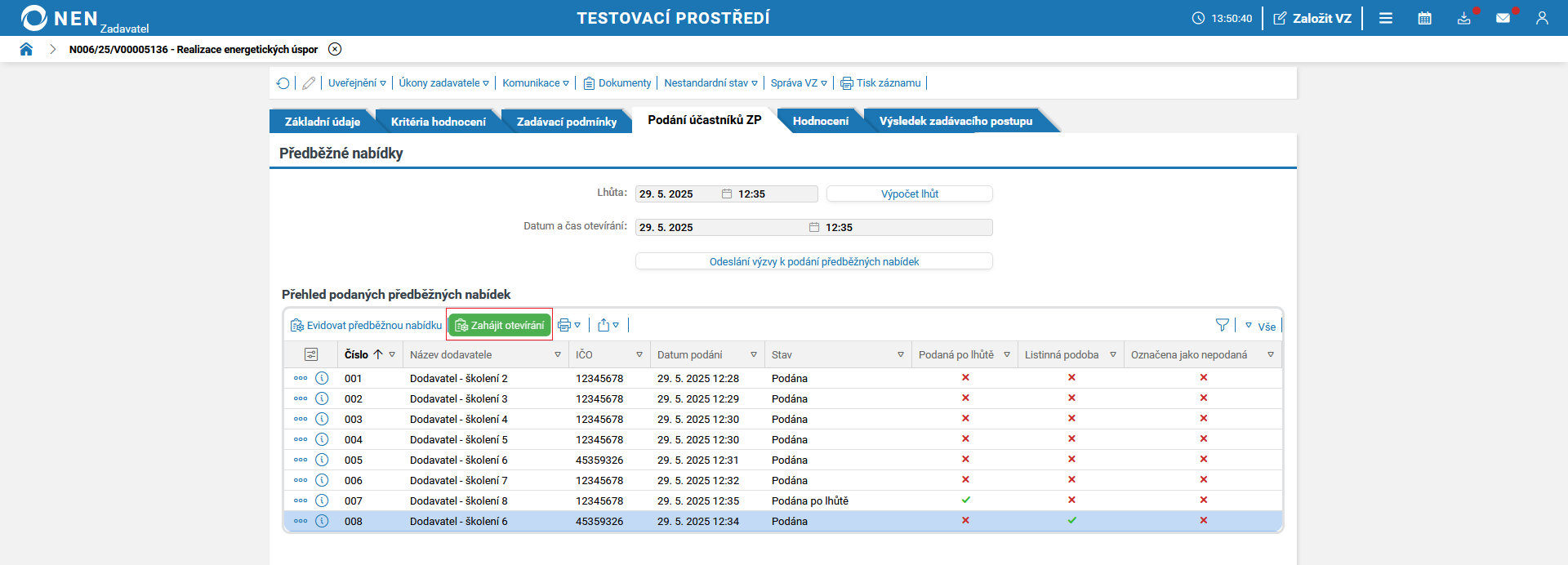 Po uplynutí lhůty pro podání předběžných nabídek/nabídek systém NEN v tabulce „Přehled podaných předběžných nabídek/nabídek“ zobrazí tlačítko „Zahájit otevírání“.