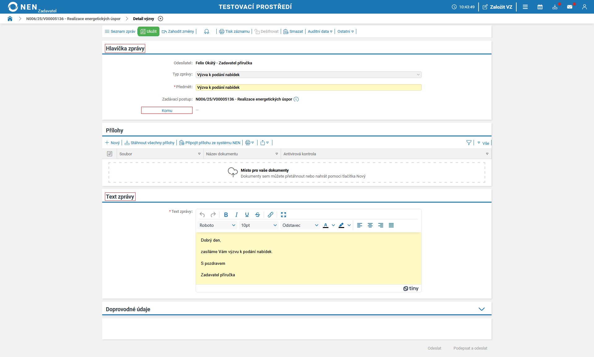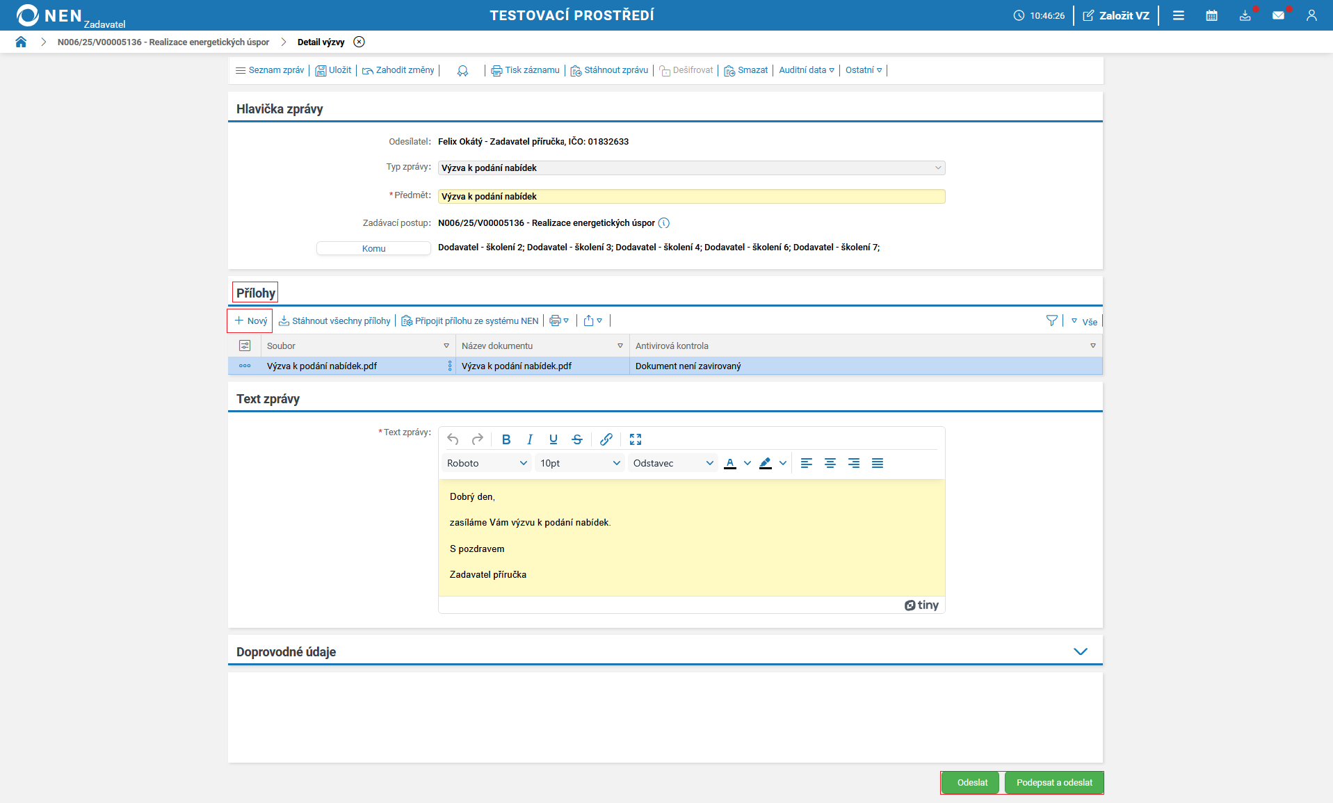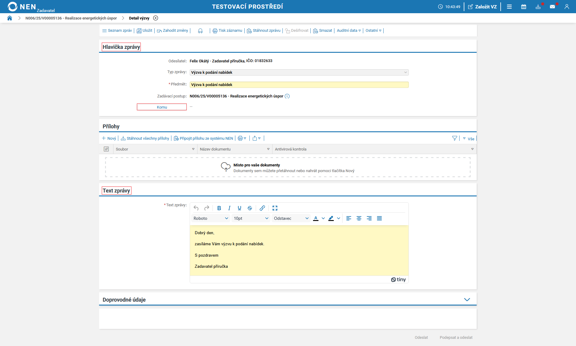 Vyplňte lhůtu pro podání a odešlete výzvu k podání nabídek (tlačítko pro odeslání výzvy se zaktivní po vyplnění pole „Lhůta”).
