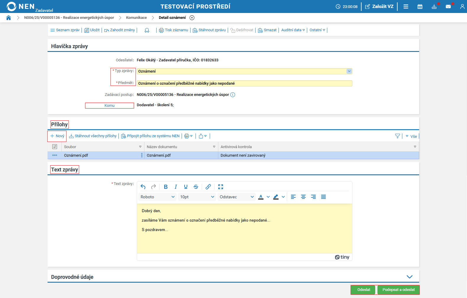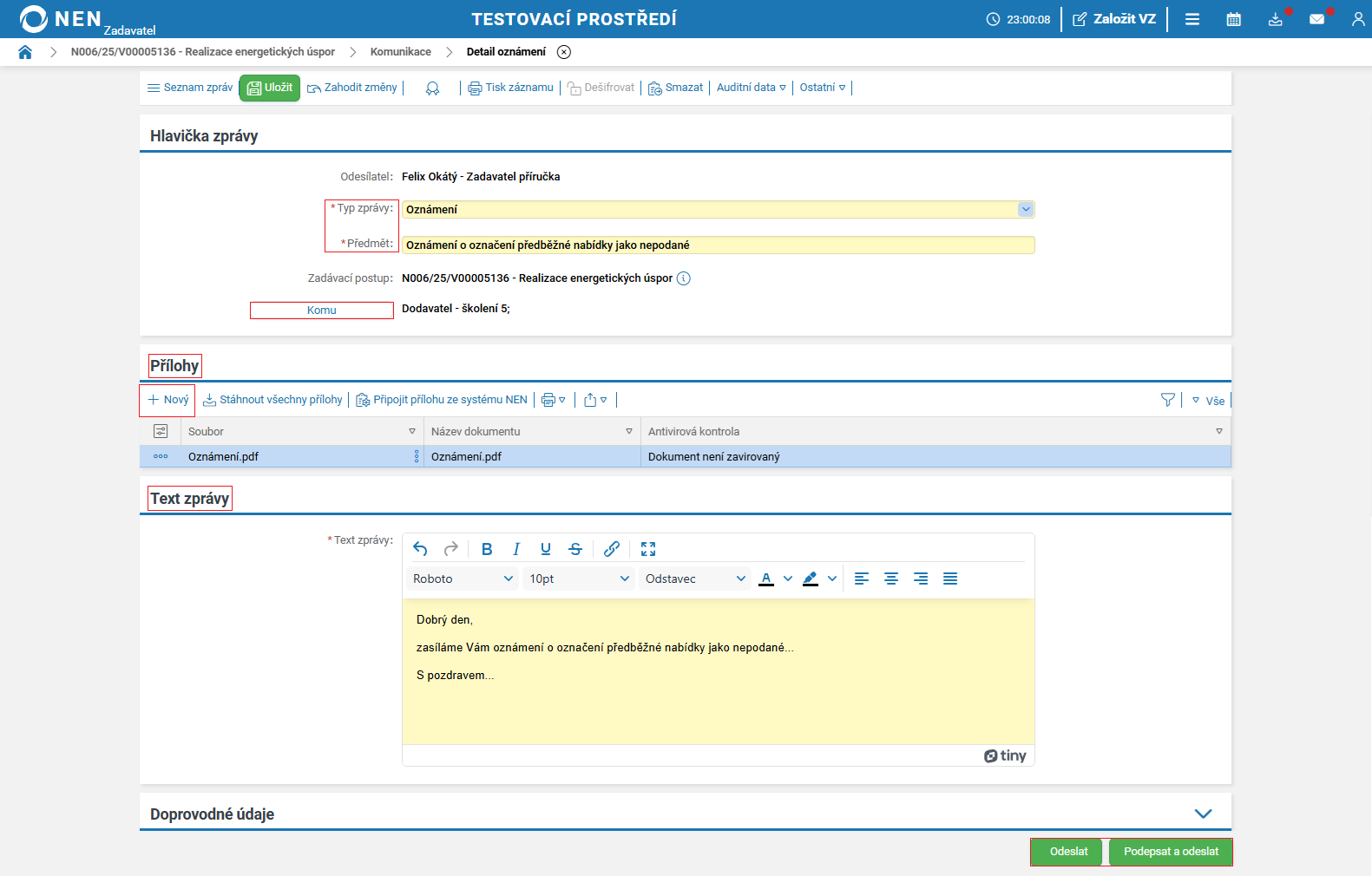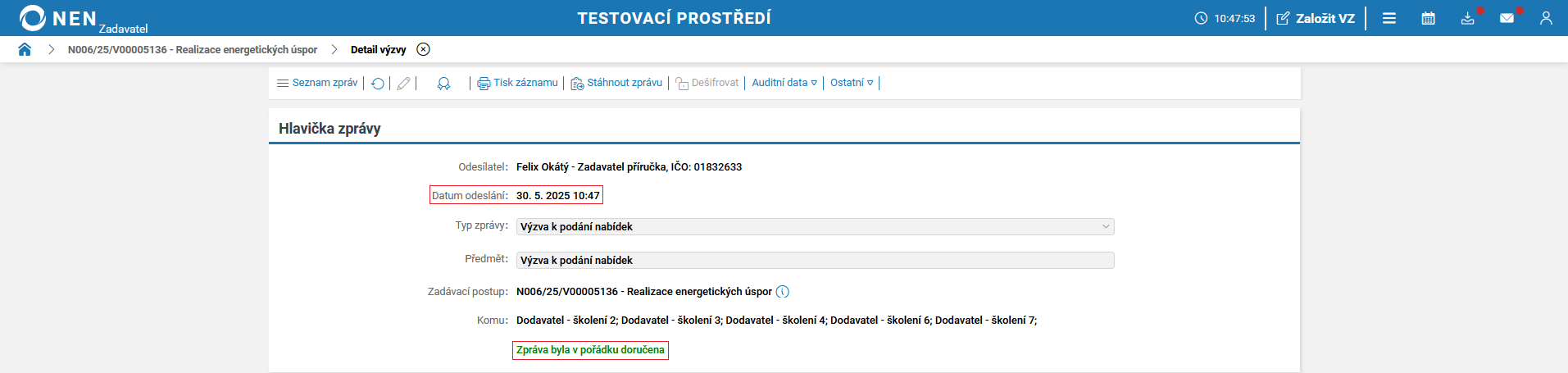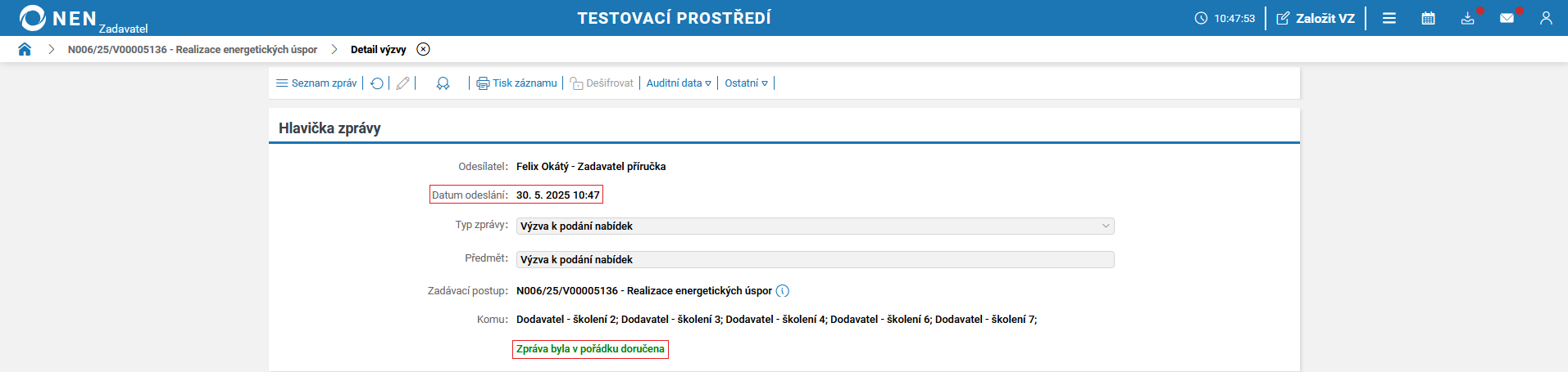 Vyplňte lhůtu pro podání a odešlete výzvu k podání nabídek (tlačítko pro odeslání výzvy se zaktivní po vyplnění pole „Lhůta”).