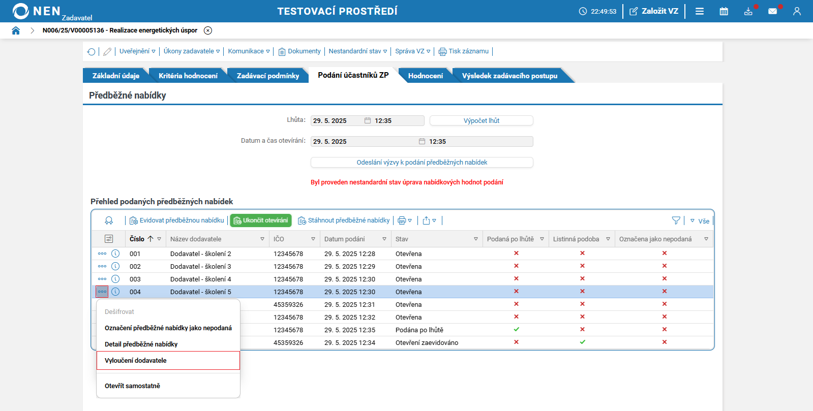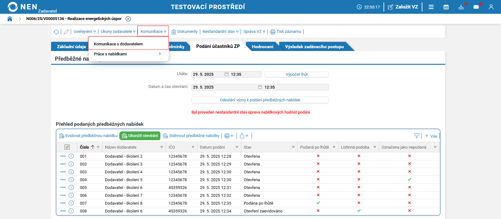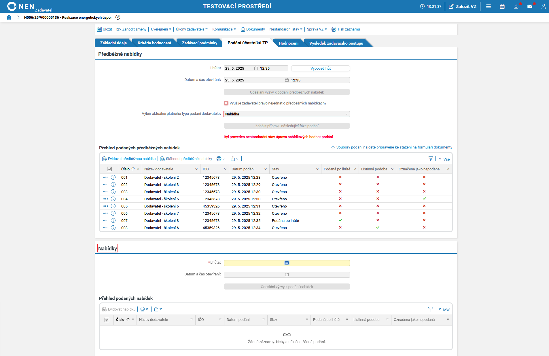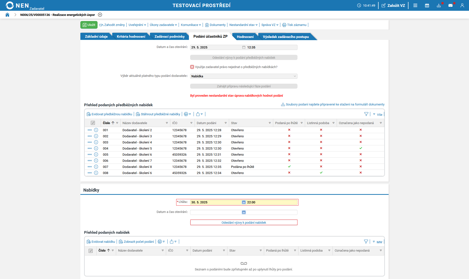 Lhůtu pro podání nabídek lze změnit prostřednictvím nestandardních stavů č.1 nebo č. 46. Tyto nestandardní stavy můžete spustit pouze před uplynutím lhůty pro podání nabídek.