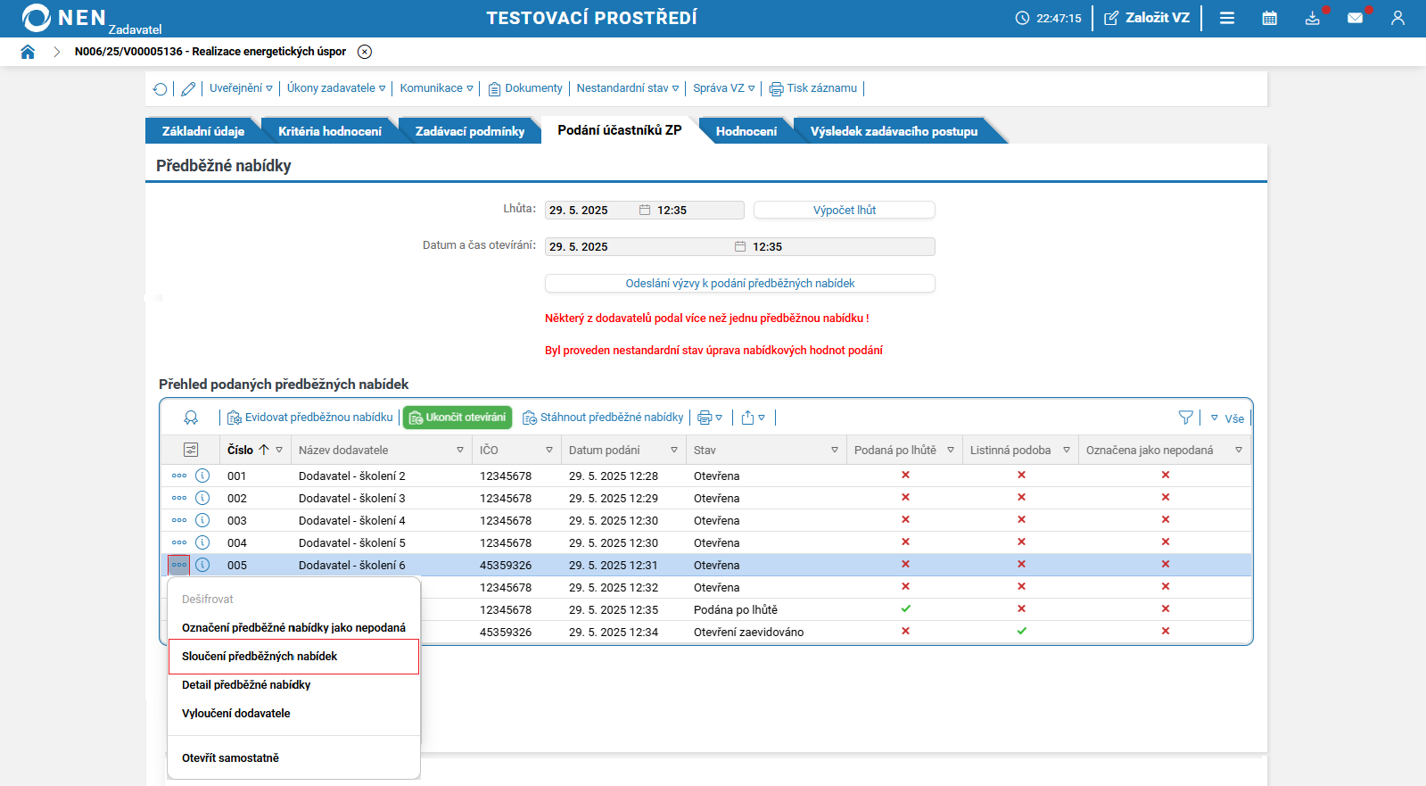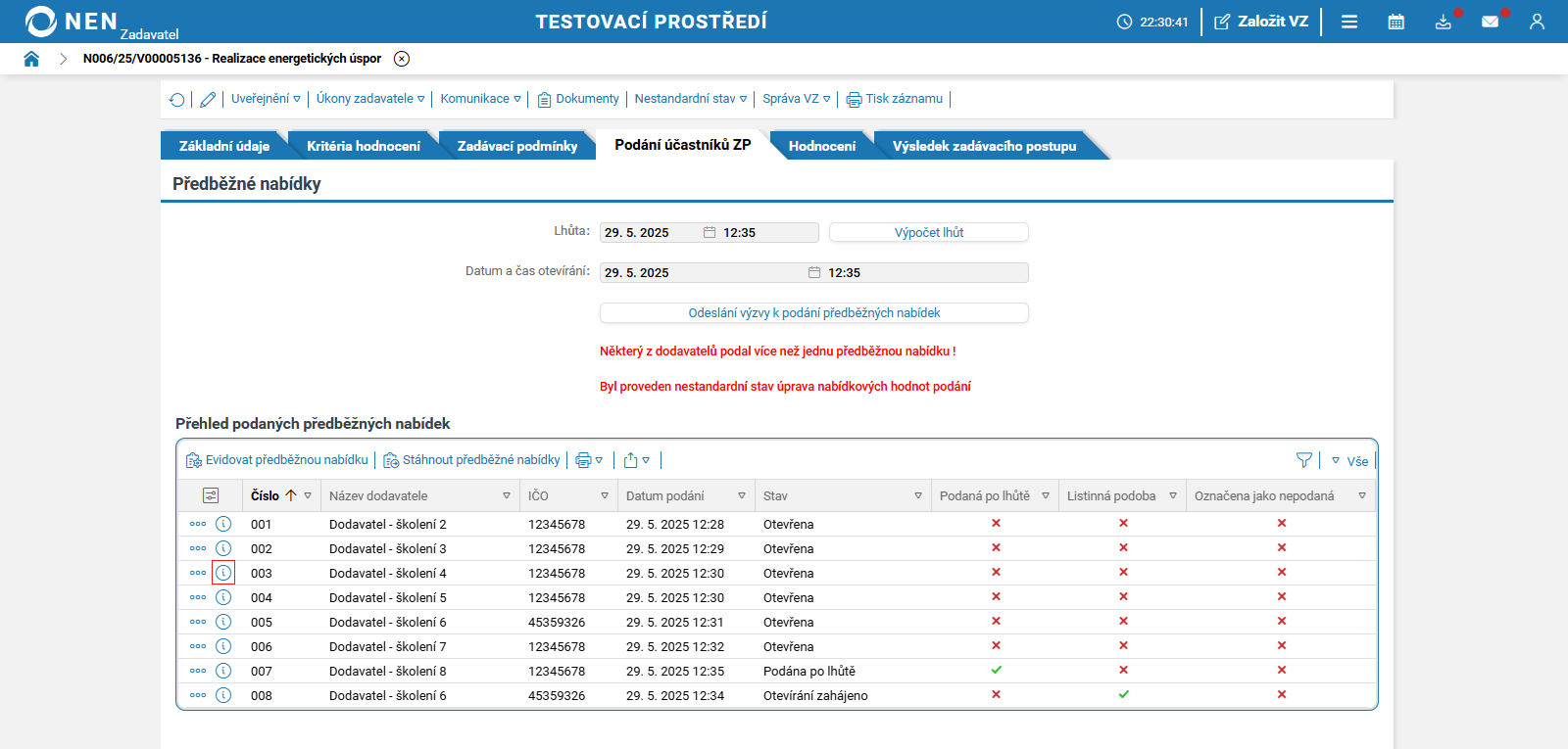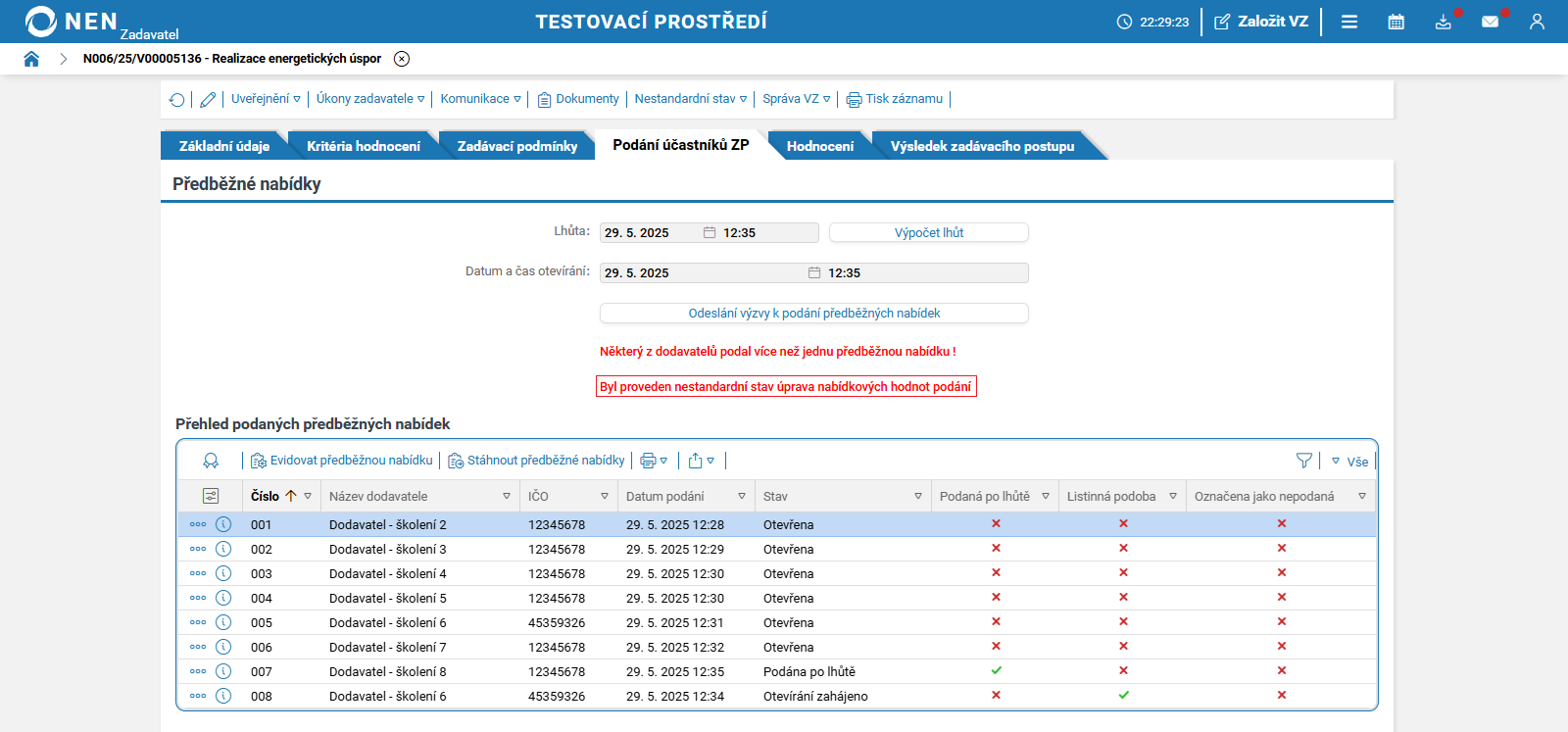 Lhůtu pro podání nabídek lze změnit prostřednictvím nestandardních stavů č.1 nebo č. 46. Tyto nestandardní stavy můžete spustit pouze před uplynutím lhůty pro podání nabídek.