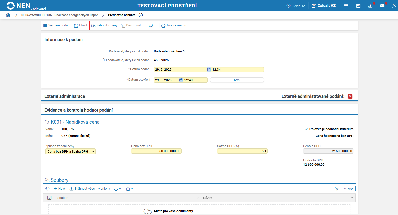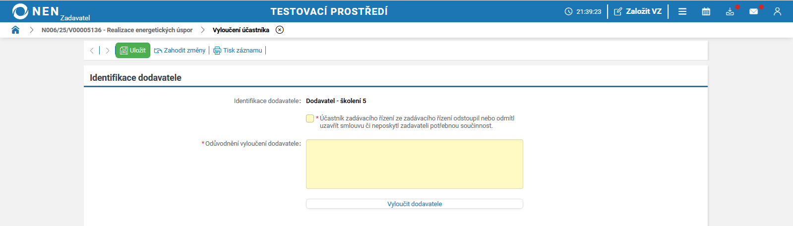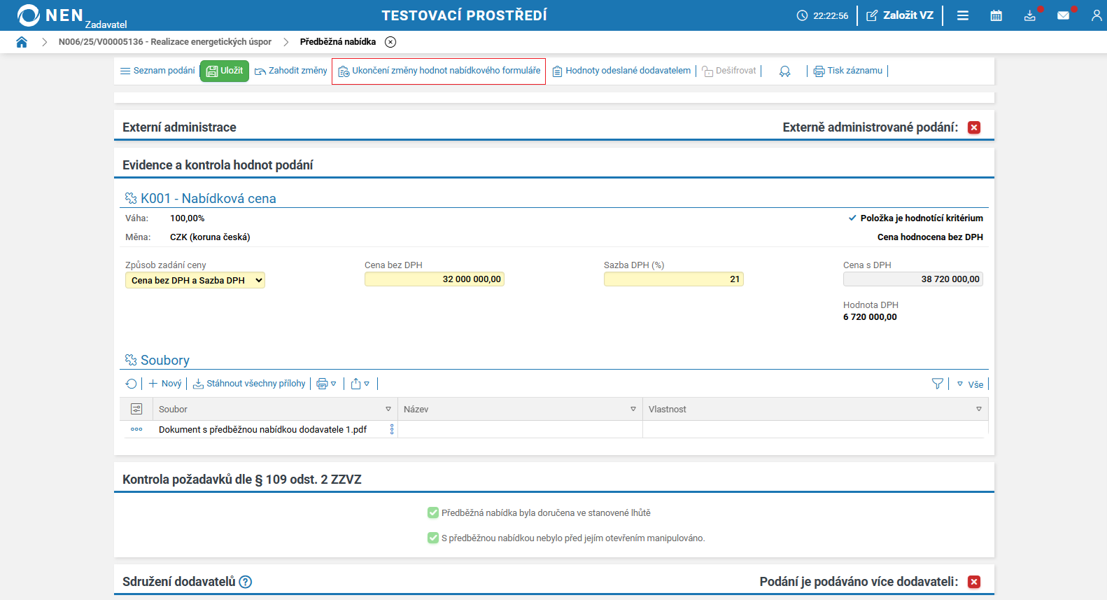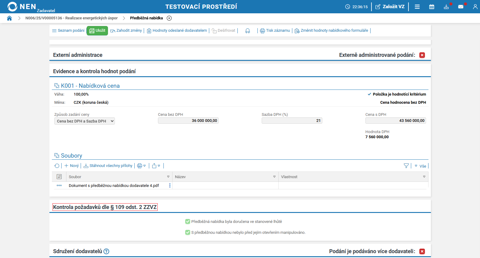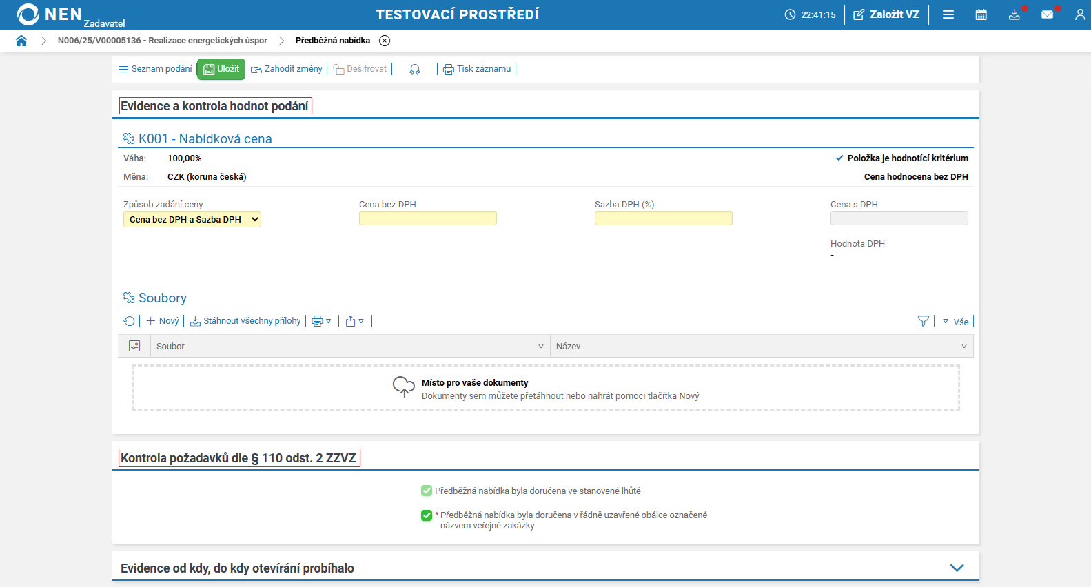 Systém NEN automaticky nastaví v tomto checkboxu „křížek“ (vyzýváte dodavatele k podání nabídky). Pokud změníte tento checkbox na „fajfku“, nevybíráte již další fázi podání. Systém NEN zobrazí tlačítko „Ukončit příjem podání“. Po kliknutí na toto tlačítko pokračujte na záložky „Hodnocení“ či „Výsledek zadávacího postupu“.
