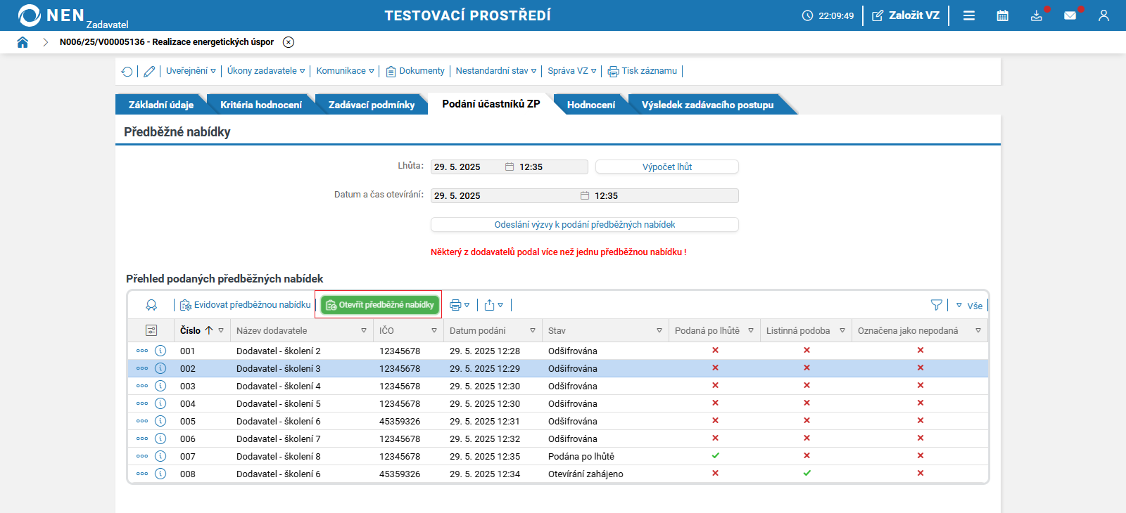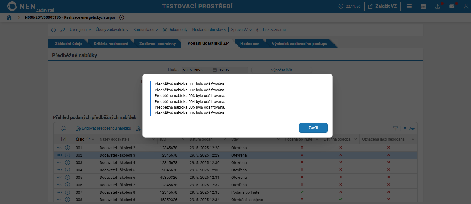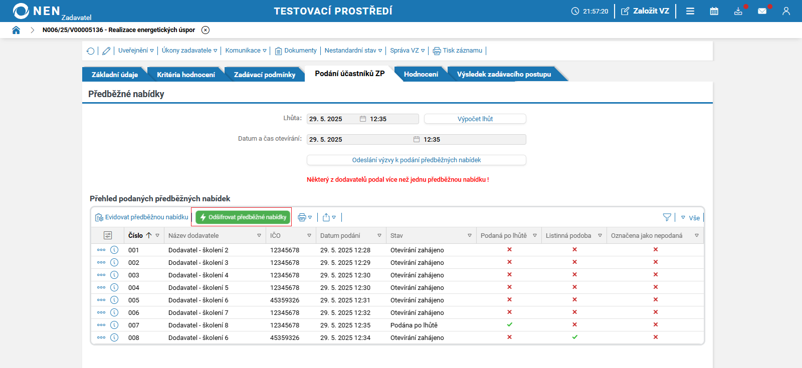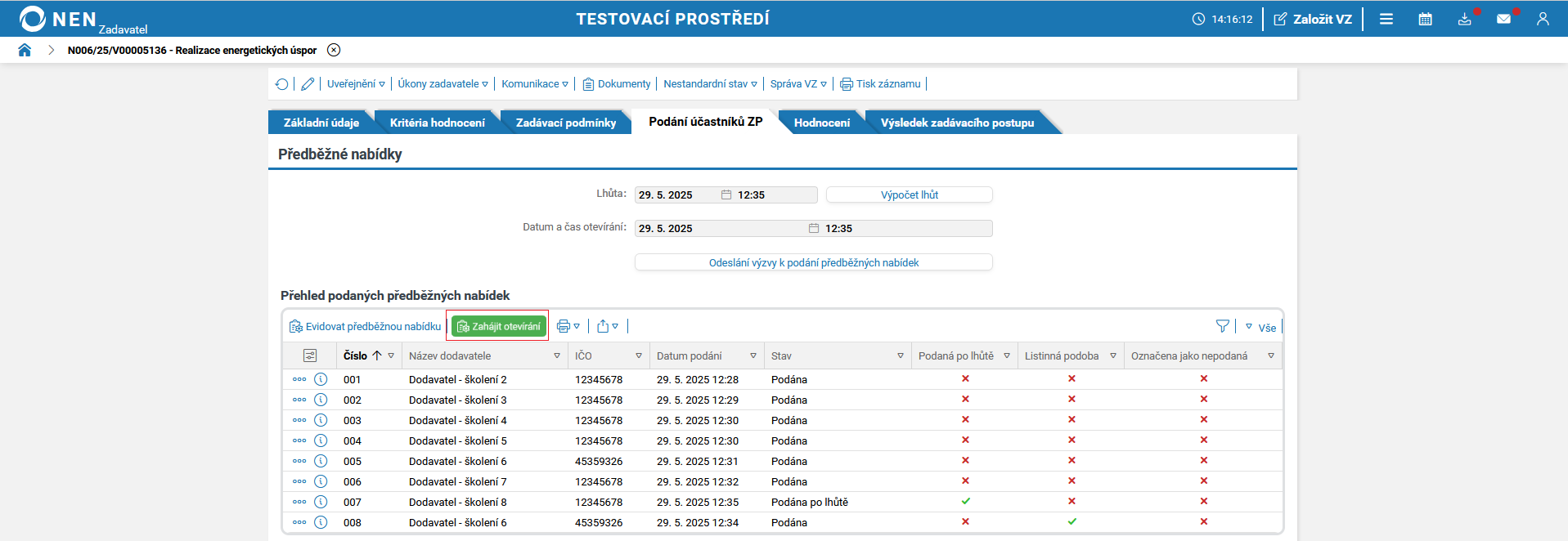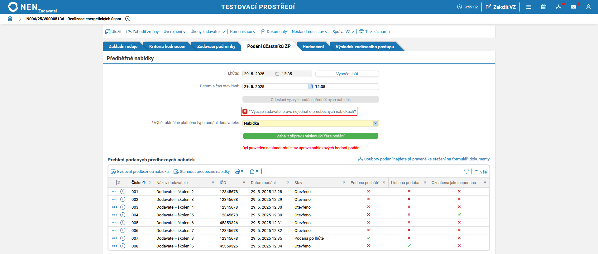 Po uplynutí lhůty pro podání předběžných nabídek systém NEN v tabulce „Přehled podaných předběžných nabídek“ zobrazí tlačítko „Zahájit otevírání“.