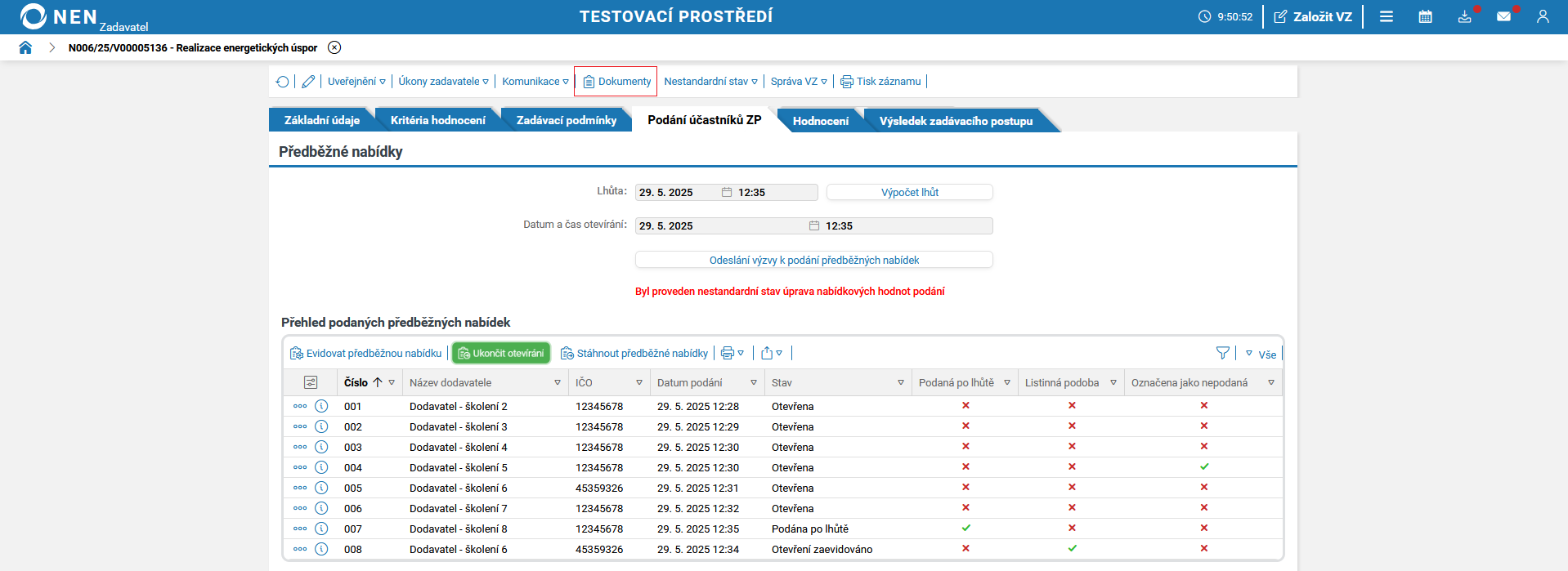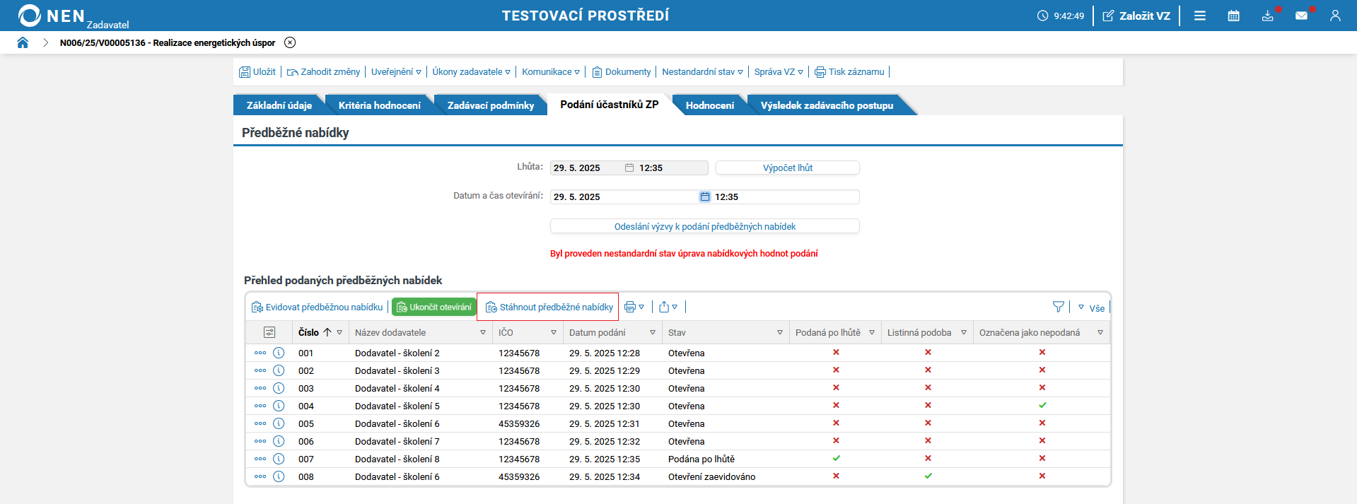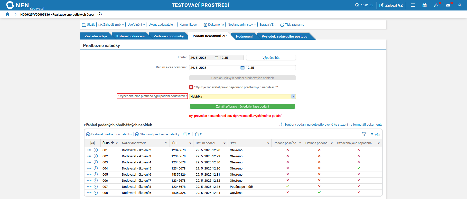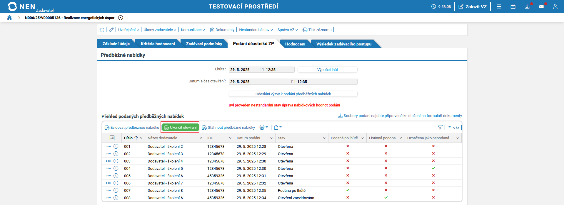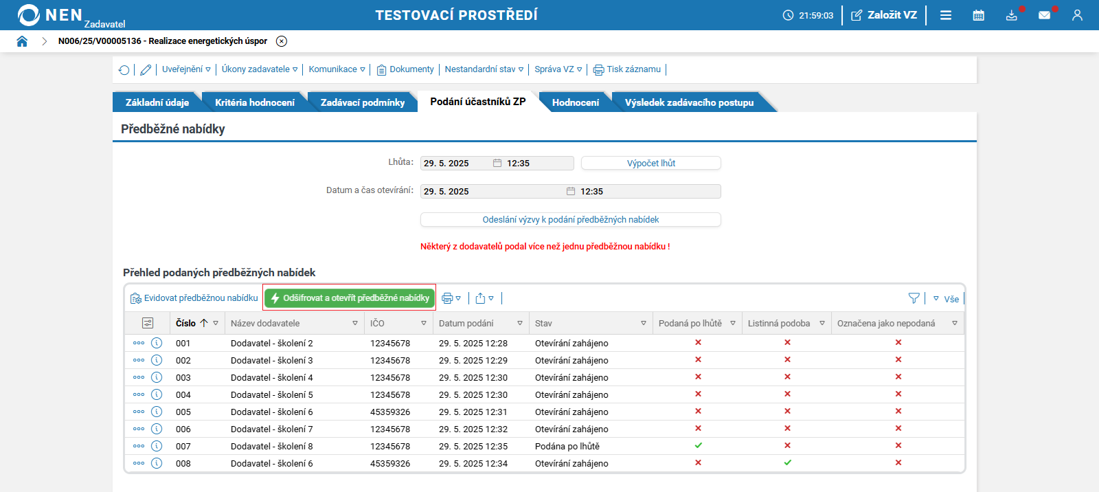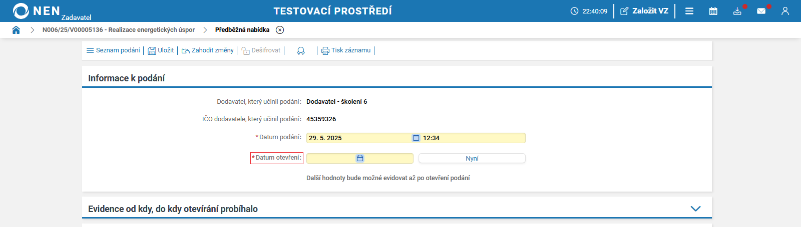 Po uplynutí lhůty pro podání předběžných nabídek systém NEN v tabulce „Přehled podaných předběžných nabídek“ zobrazí tlačítko „Zahájit otevírání“.