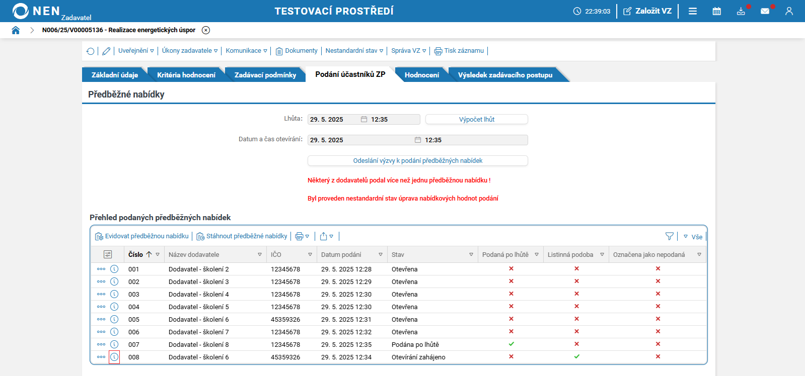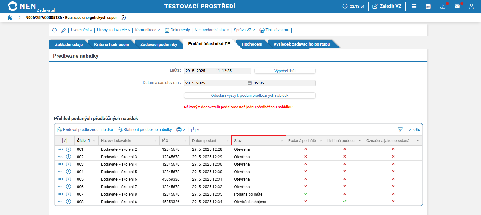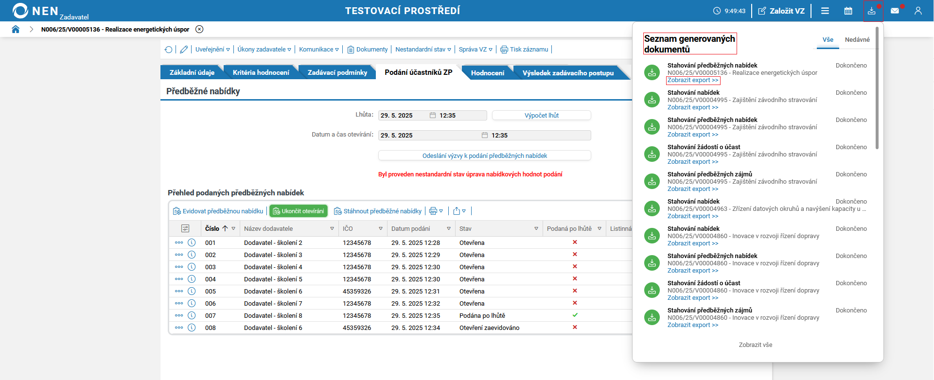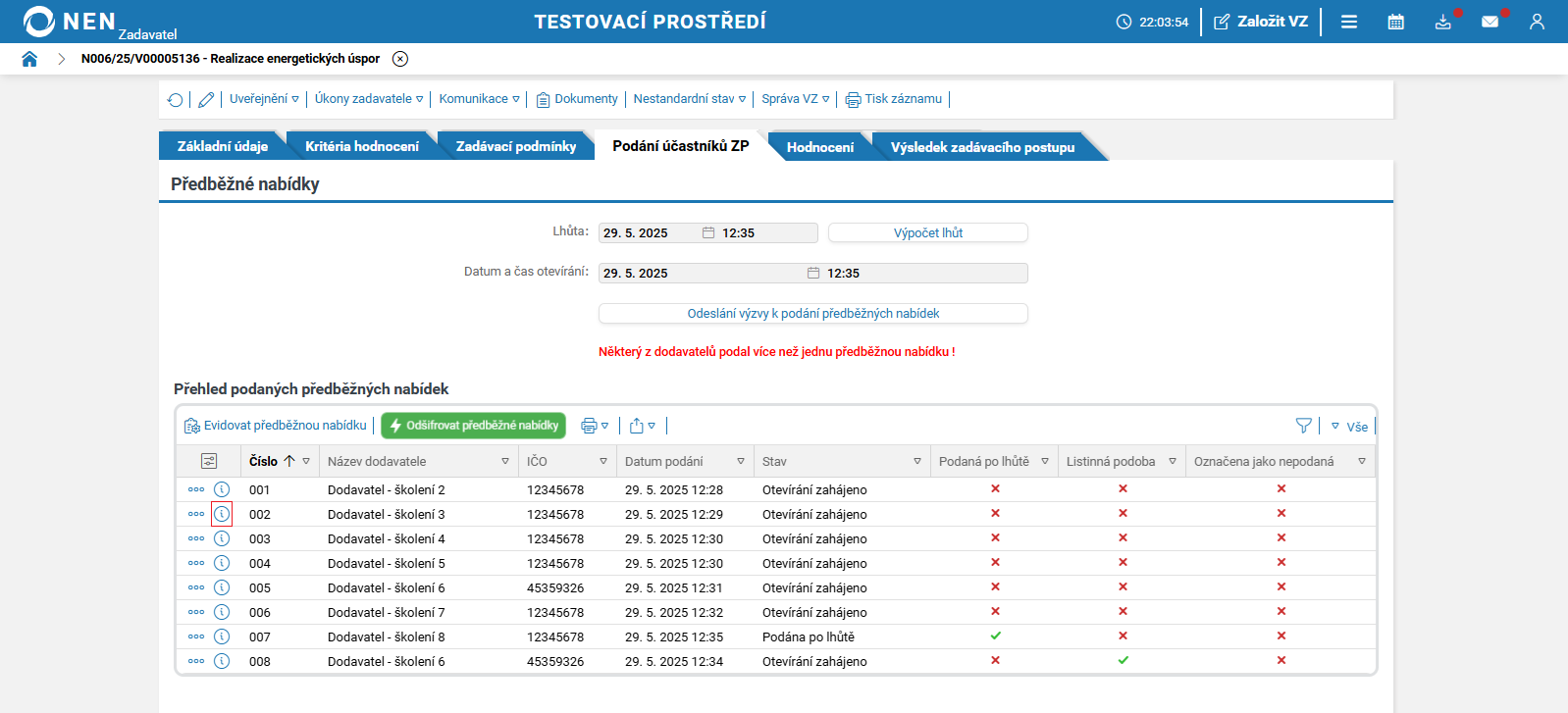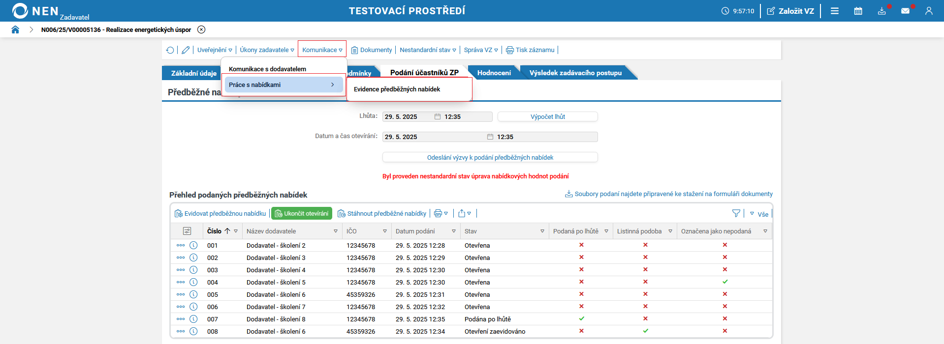 Po uplynutí lhůty pro podání předběžných nabídek systém NEN v tabulce „Přehled podaných předběžných nabídek“ zobrazí tlačítko „Zahájit otevírání“.