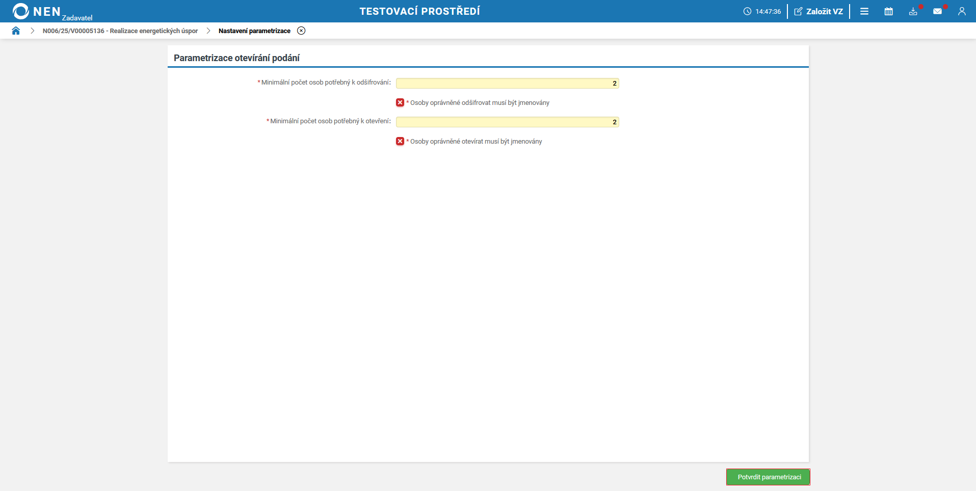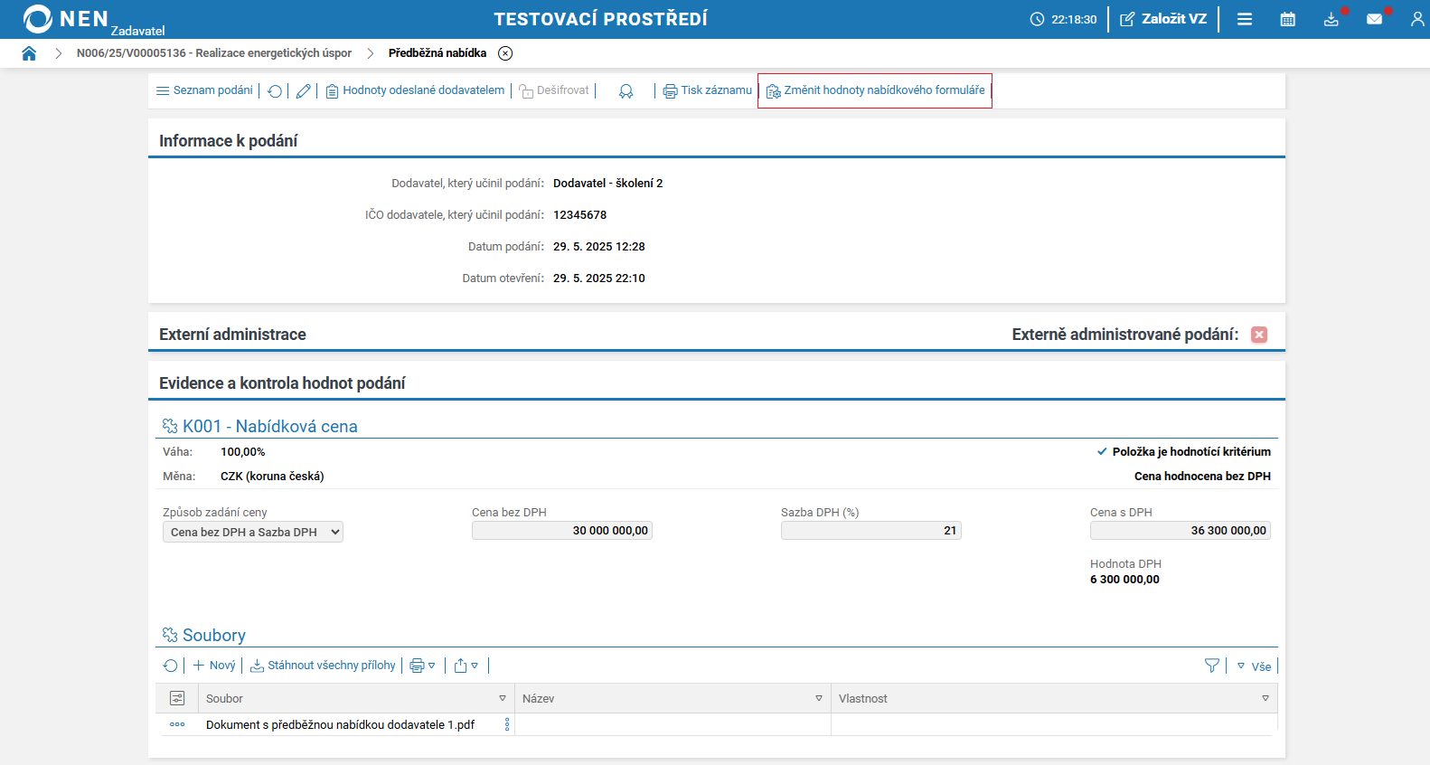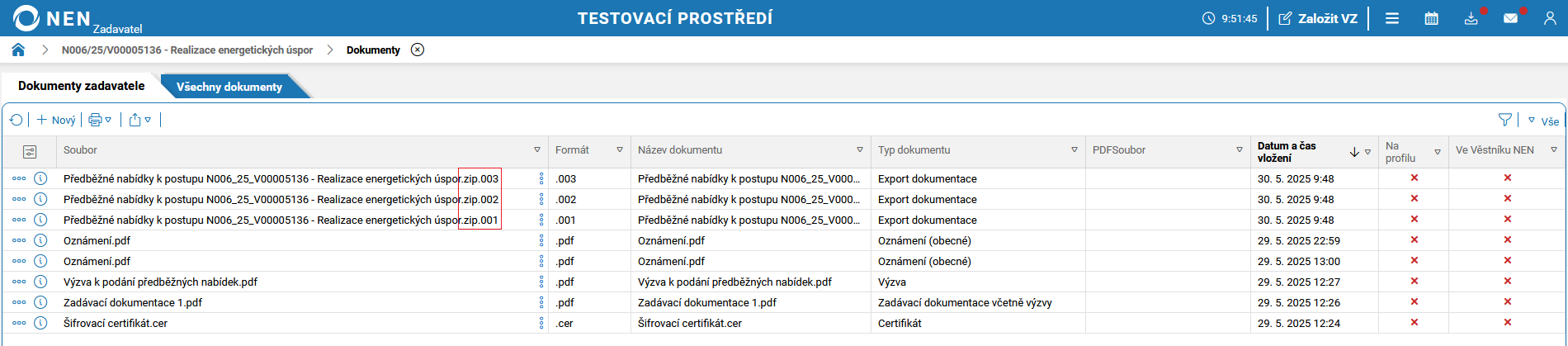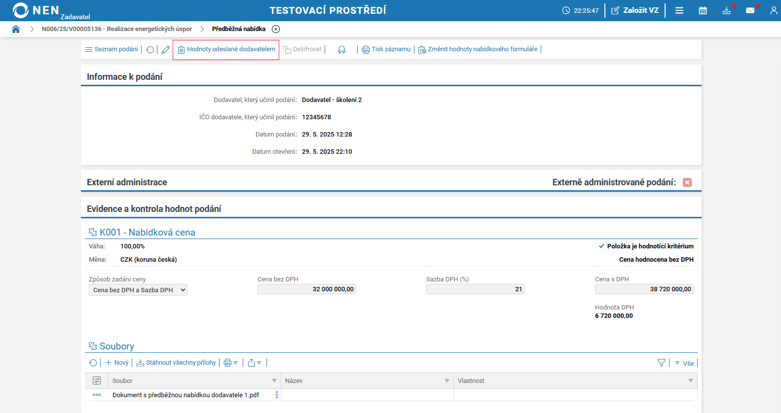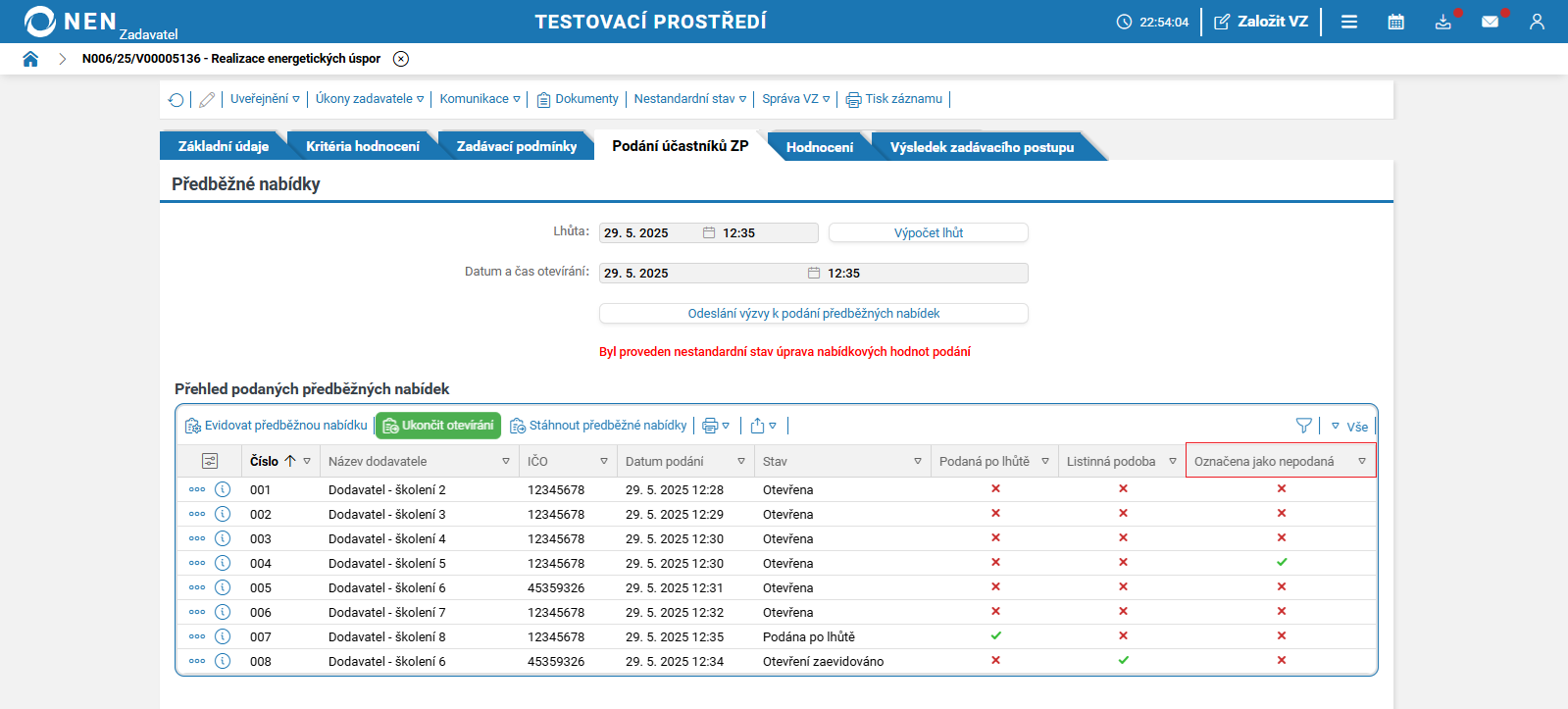 Po uplynutí lhůty pro podání předběžných nabídek systém NEN v tabulce „Přehled podaných předběžných nabídek“ zobrazí tlačítko „Zahájit otevírání“.