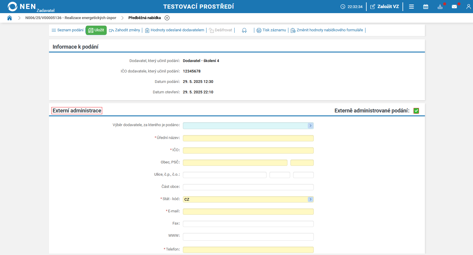 Pro přípravu další fáze podání systém NEN automaticky předvyplní pole „Výběr aktuálně platného typu podání dodavatele“.