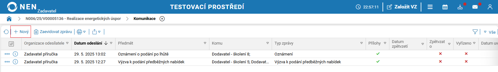 Podání dohledáte v systému NEN přes tlačítko „Komunikace“ → „Práce s nabídkami“ → „Evidence předběžných nabídek“, které se nachází v horní liště.