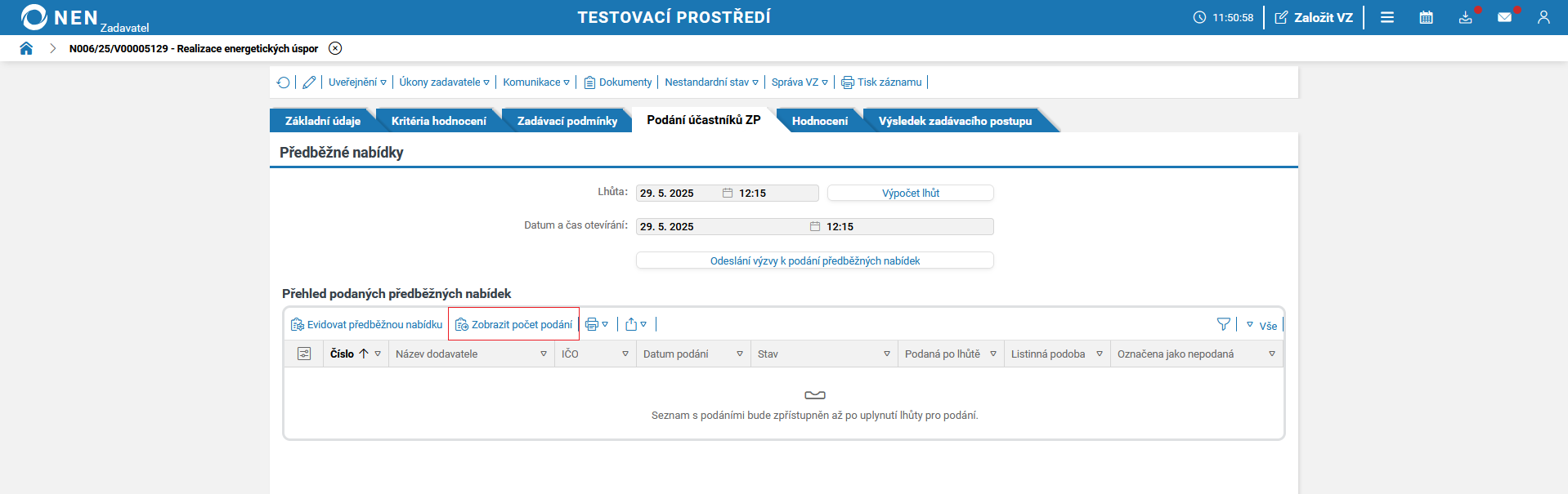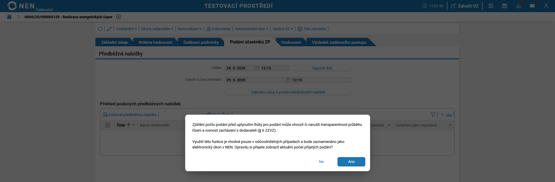 Upozorňujeme, že systém NEN před uplynutím lhůty pro podání nezobrazí informace o tom, kdo podání učinil a ani počet doručených podání. V přehledu podaných předběžných nabídek/nabídek nebude viditelné žádné podání, a to elektronické ani zaevidované, dokud poběží lhůta pro podání.