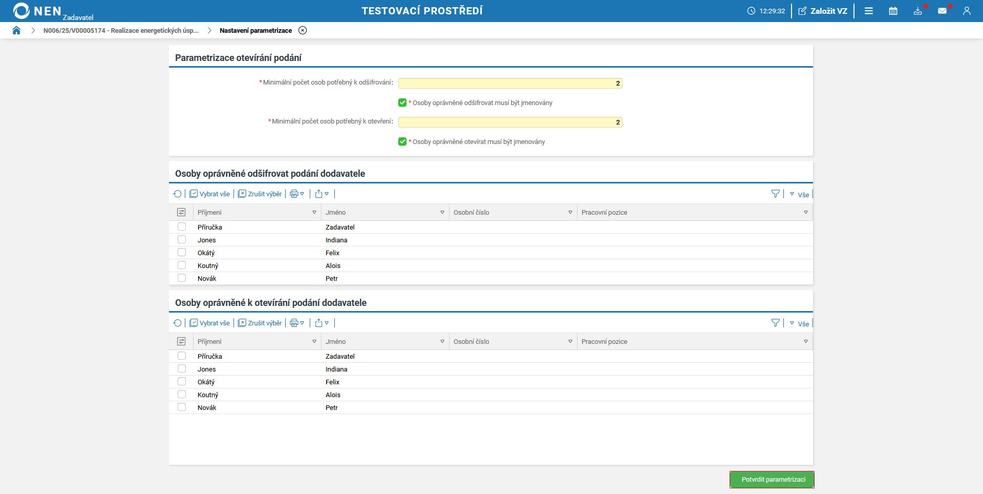 Zobrazí se formulář „Nastavení parametrizace“. Na tomto formuláři nastavte minimální počet osob potřebný k otevření nabídek (tento proces je stejný jako v případě otevírání nabídek).