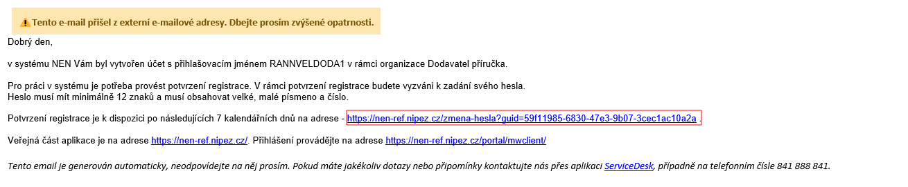 Potvrzení registrace nového uživatele provedete kliknutím na odkaz v e-mailu ve stanovené lhůtě 7 kalendářních dnů. Po kliknutí na uvedený odkaz budete přesměrováni do systému NEN pro vytvoření uživatelského hesla.
