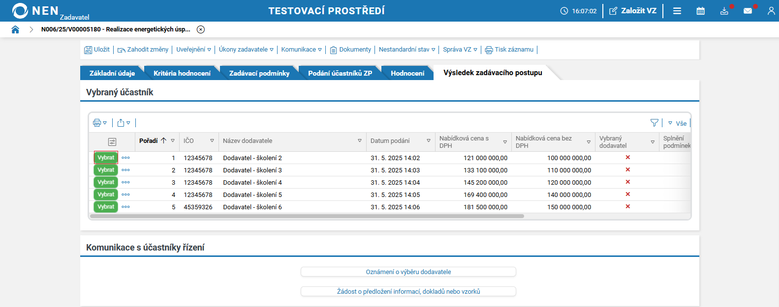Výběr ekonomicky nejvýhodnější nabídky proveďte pomocí tlačítka „Vybrat“.