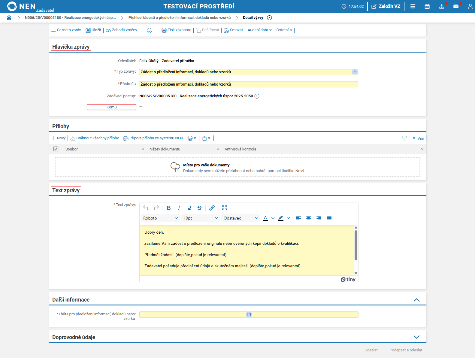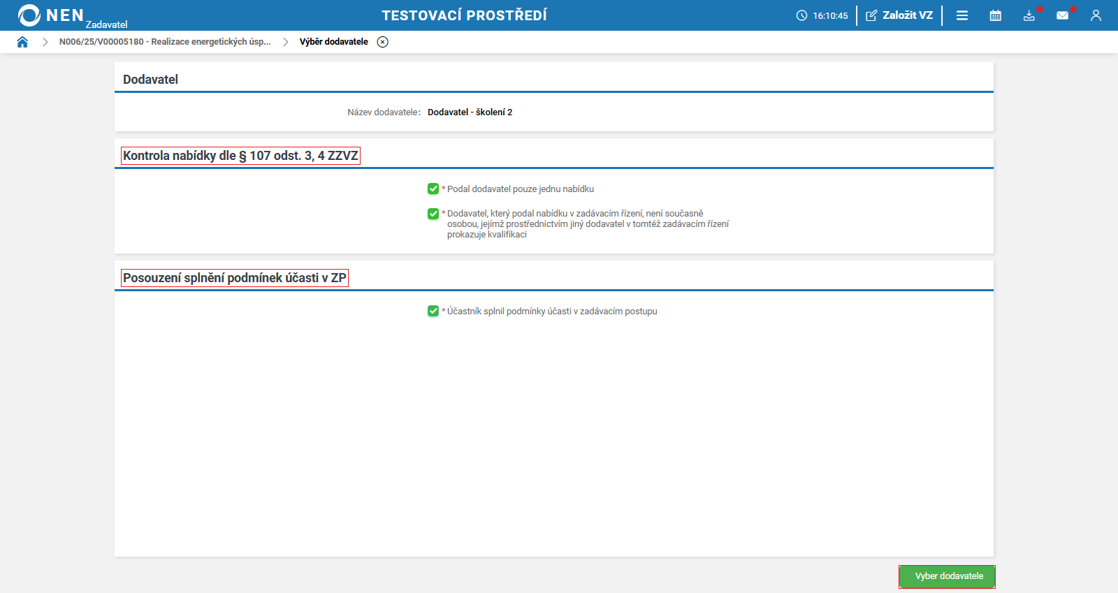 V bloku „Posouzení splnění podmínek účasti v ZP” proveďte kontrolu nabídky dle § 107 odst. 3, 4 ZZVZ a posouzení splnění podmínek účasti v zadávacím postupu (pouze pokud jste neprovedli přes „Úkony zadavatele” → „Posouzení splnění podmínek účasti”).
