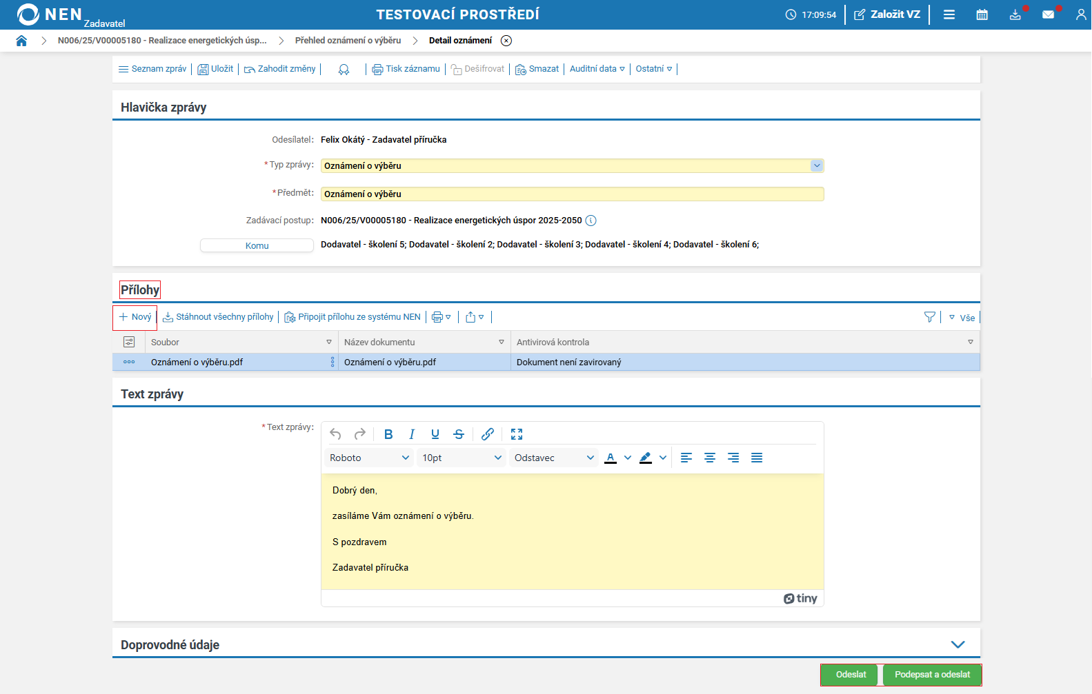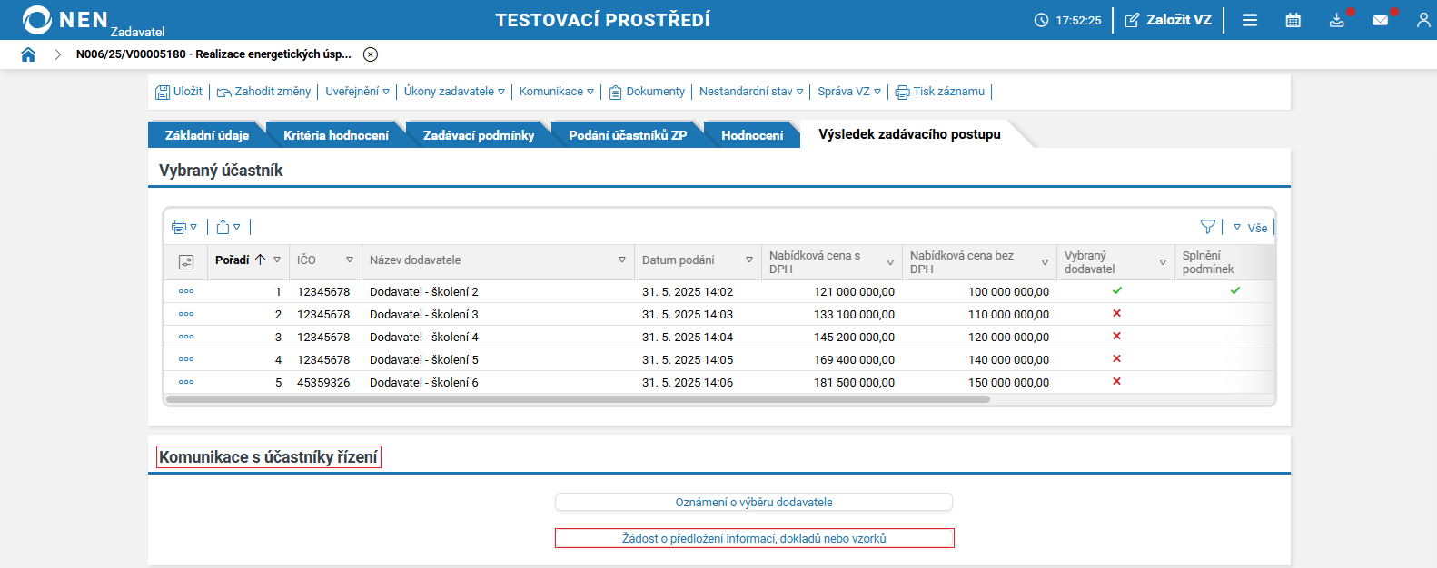 Pokud je výsledkem zadávacího řízení uzavření rámcové dohody s více dodavateli, musíte vybrat více jak jednoho dodavatele. Systém NEN Vám v takovém případě nedovolí uzavřít rámcovou dohodu s jedním dodavatelem.