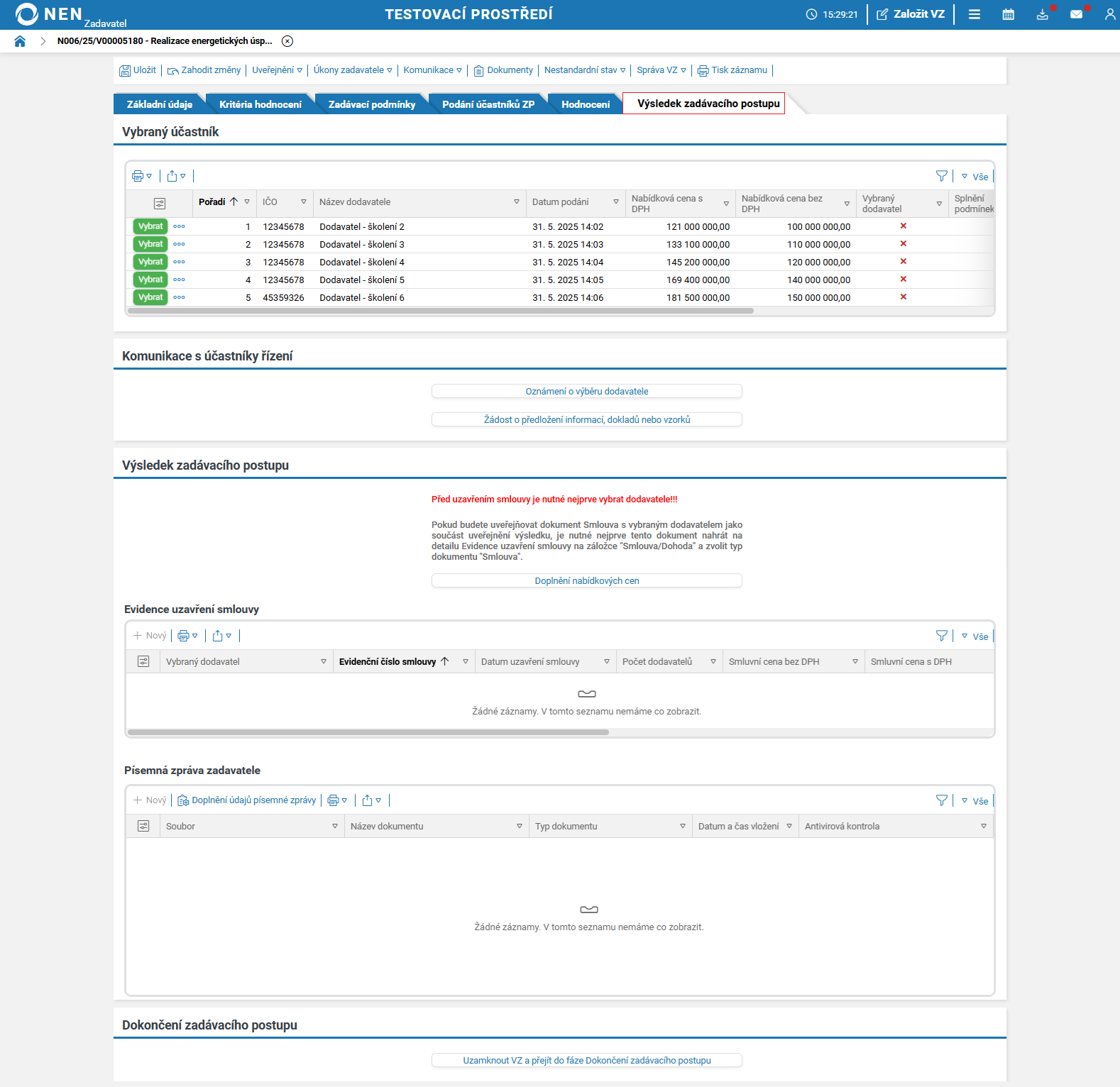 Systém NEN umožní na této záložce vybrat ekonomicky nejvýhodnější nabídku, vytvořit záznam o výběru dodavatele, zaevidovat smlouvu, uveřejnit výsledek zadávacího postupu a vložit evidenci plnění (skutečně uhrazenou cenu dle § 219 odst. 3 ZZVZ).
