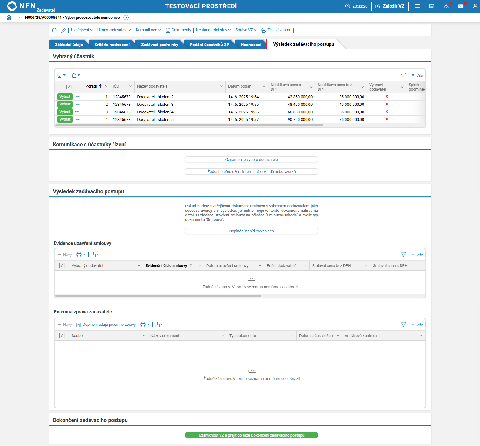 Systém NEN umožní na této záložce vybrat ekonomicky nejvýhodnější nabídku, vytvořit záznam o výběru dodavatele, zaevidovat smlouvu, uveřejnit výsledek zadávacího postupu a vložit evidenci plnění (skutečně uhrazenou cenu dle § 219 odst. 3 ZZVZ).