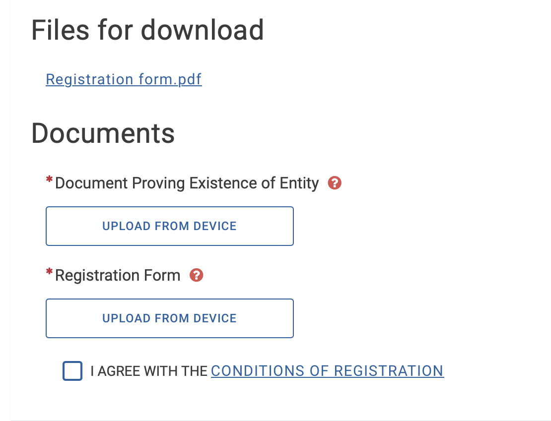 The list of mandatory fields may vary depending on the specific information provided by the applicant. Registration is completed by submitting the application. You must attach the completed and electronically signed Registration Form and other required documents marked as mandatory to your application.